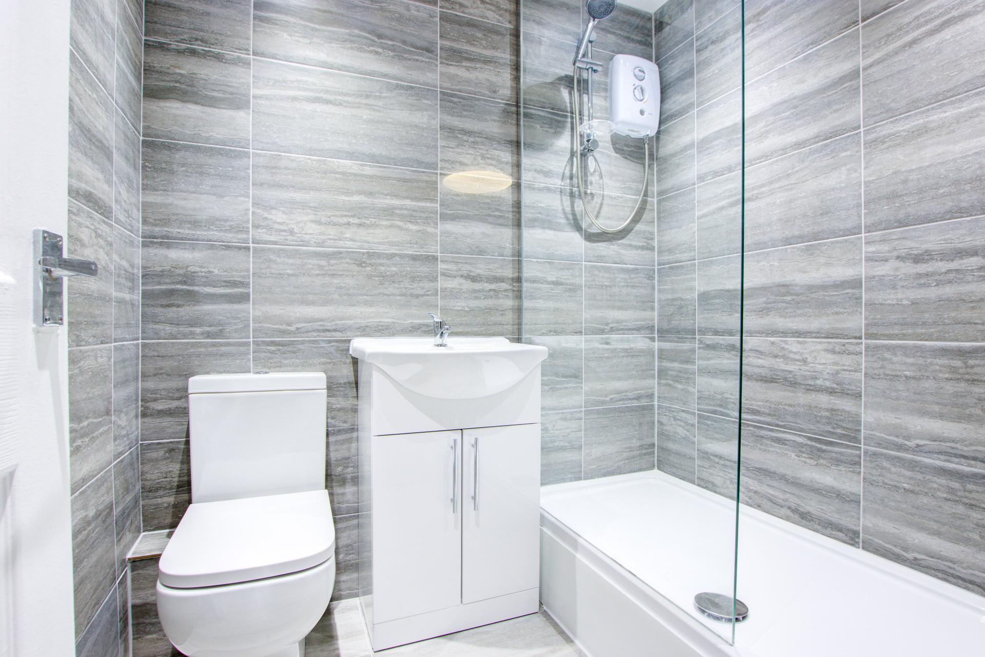 Walk-in double shower with glazed screen, tiled walls & floor, WC, wash basin with vanity storage and central heating towel rail.