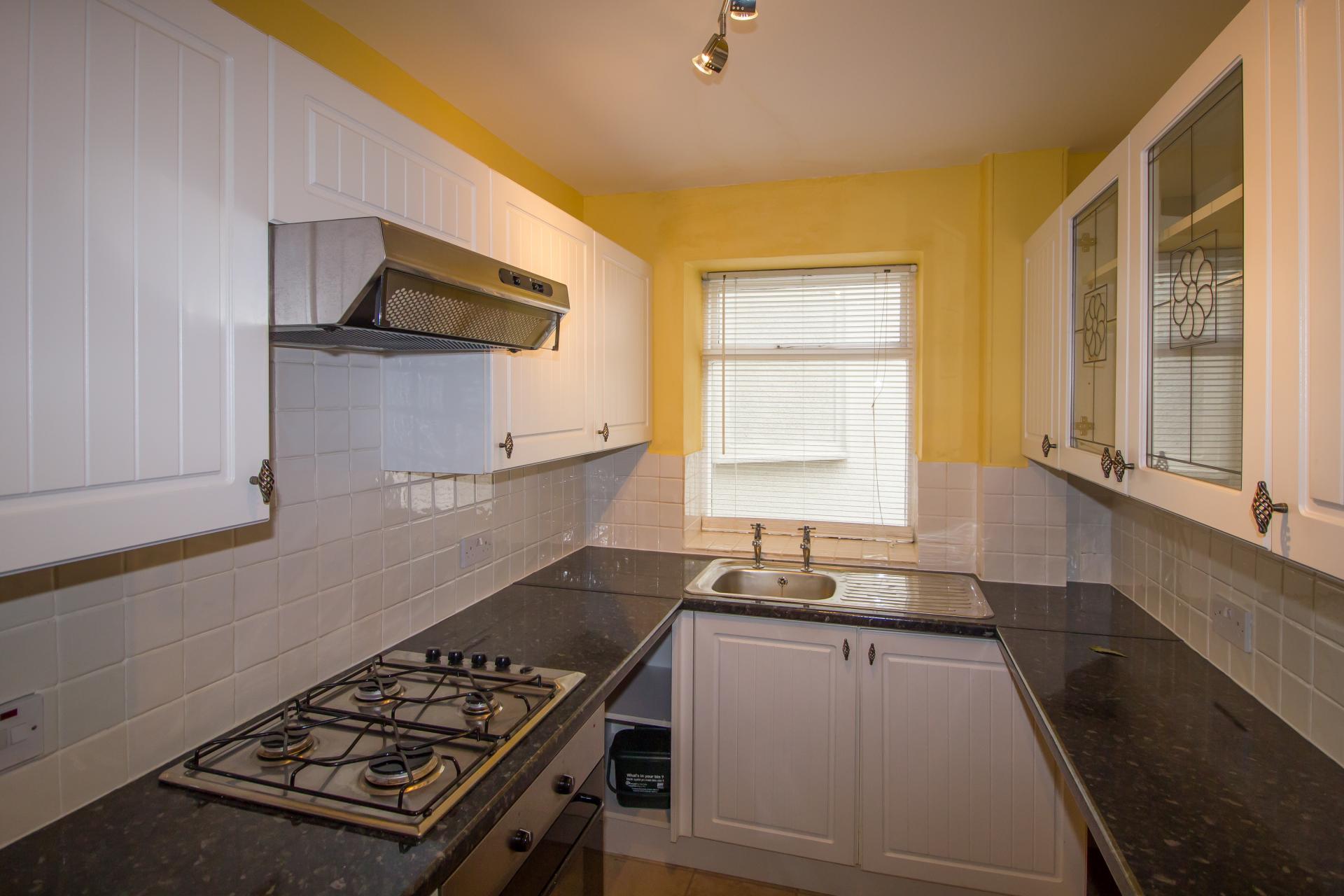 uPVC double glazed window to rear. Fitted kitchen comprising wall and base units with laminate worktops. Stainless steel sink. Tiled splash and preparation area. Four burner gas hob with oven below and extractor fan above. Freestanding washing machine and fridge freezer. Power points. Tile effect laminate flooring.