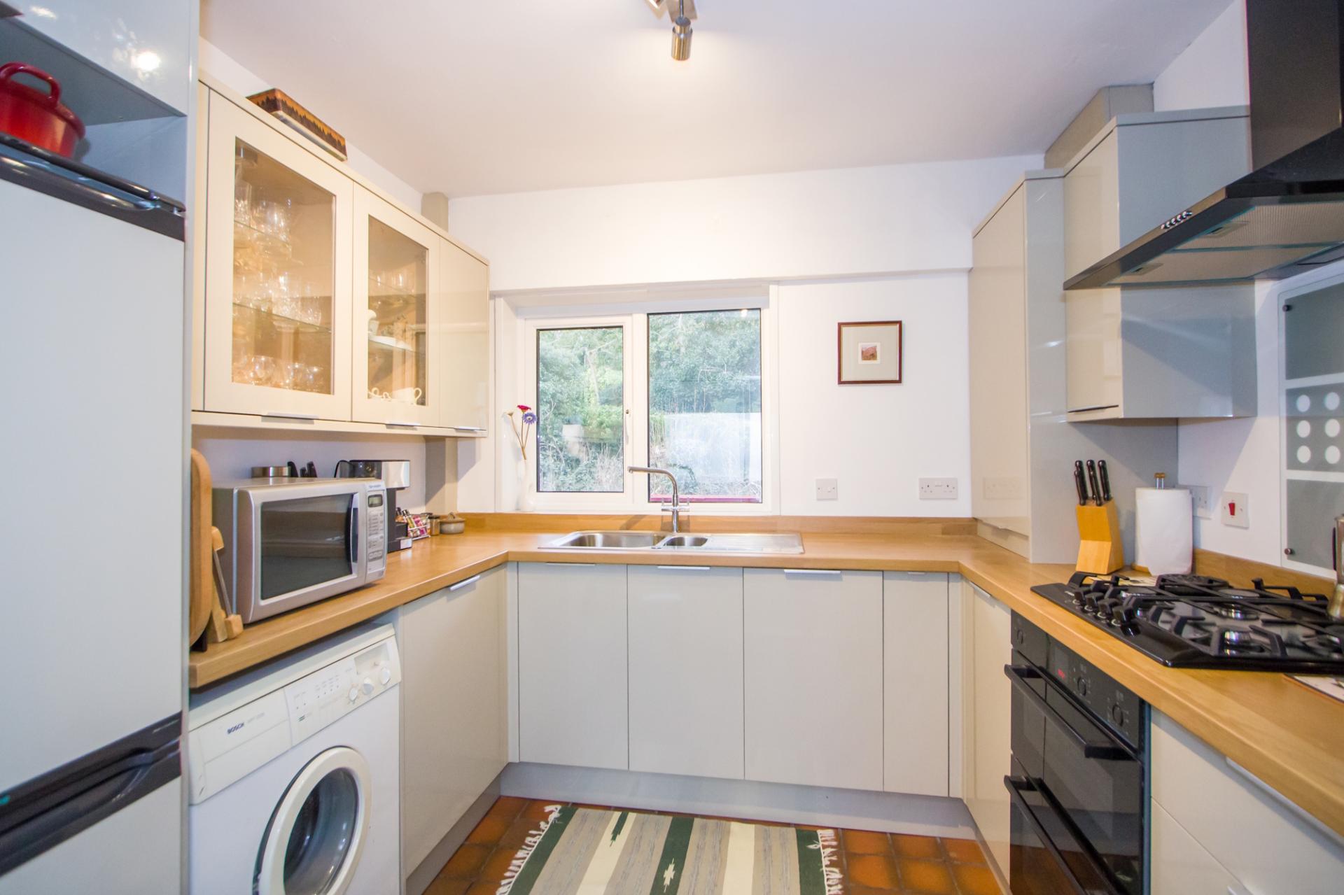 Tiled floor. Fitted kitchen comprising wall units and base units with wood effect laminate work surfaces and off-white gloss doors. Integrated appliances including an electric oven, grill, four burner gas hob, extractor hood and dishwasher. Space for a fridge freezer. Plumbing for washing machine. Cupboard with gas combination boiler. One and a half bowl stainless steel sink with drainer. Power points. uPVC double glazed window overlooking the park.