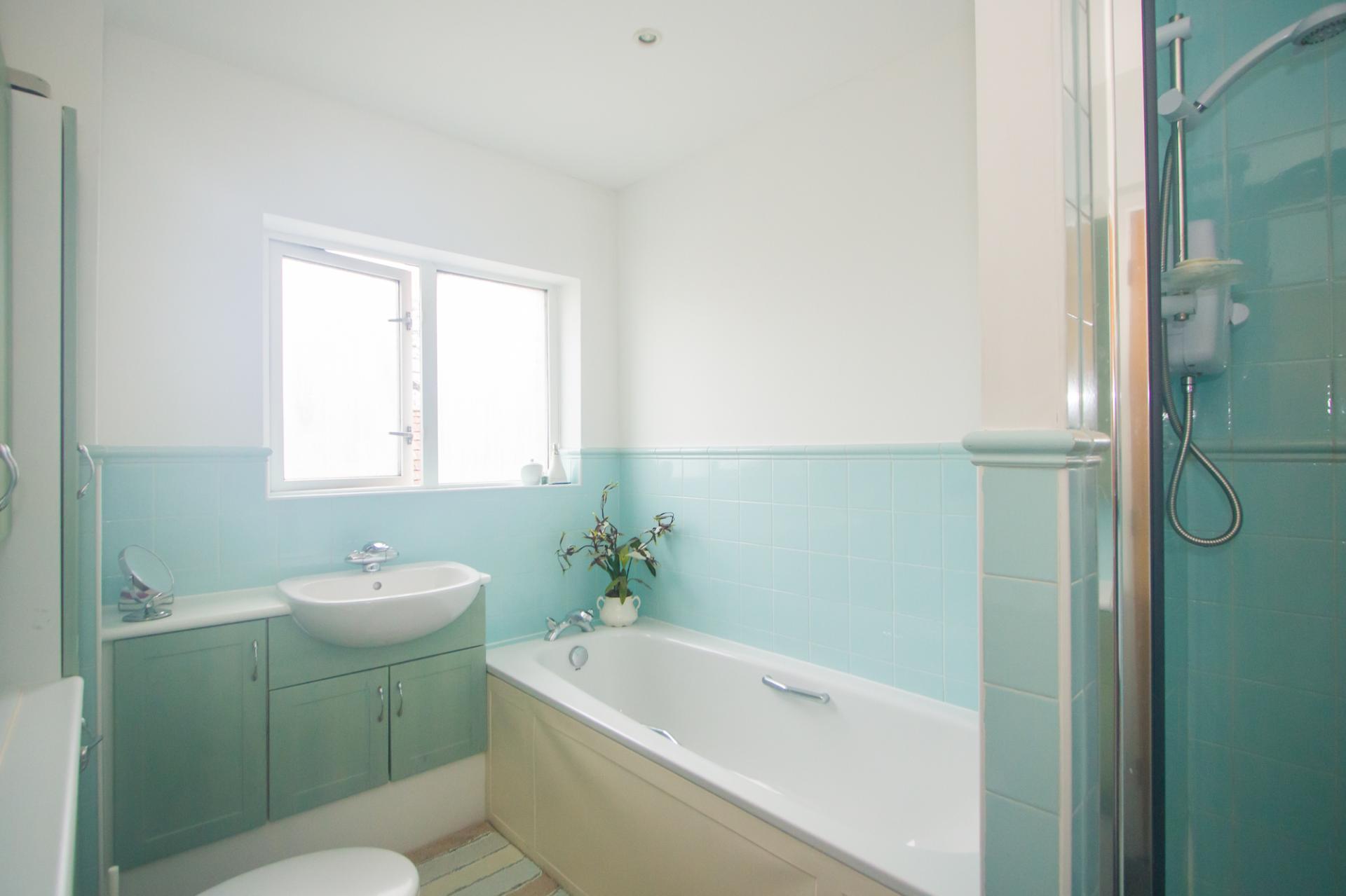 Suite comprising a shower cubicle with electric shower, paneled bath, WC, bidet and sink with storage below. Additional fitted bathroom storage. uPVC double glazed window to the side. Heated towel rail. Recessed lights. Part tiled walls. Vinyl floor.