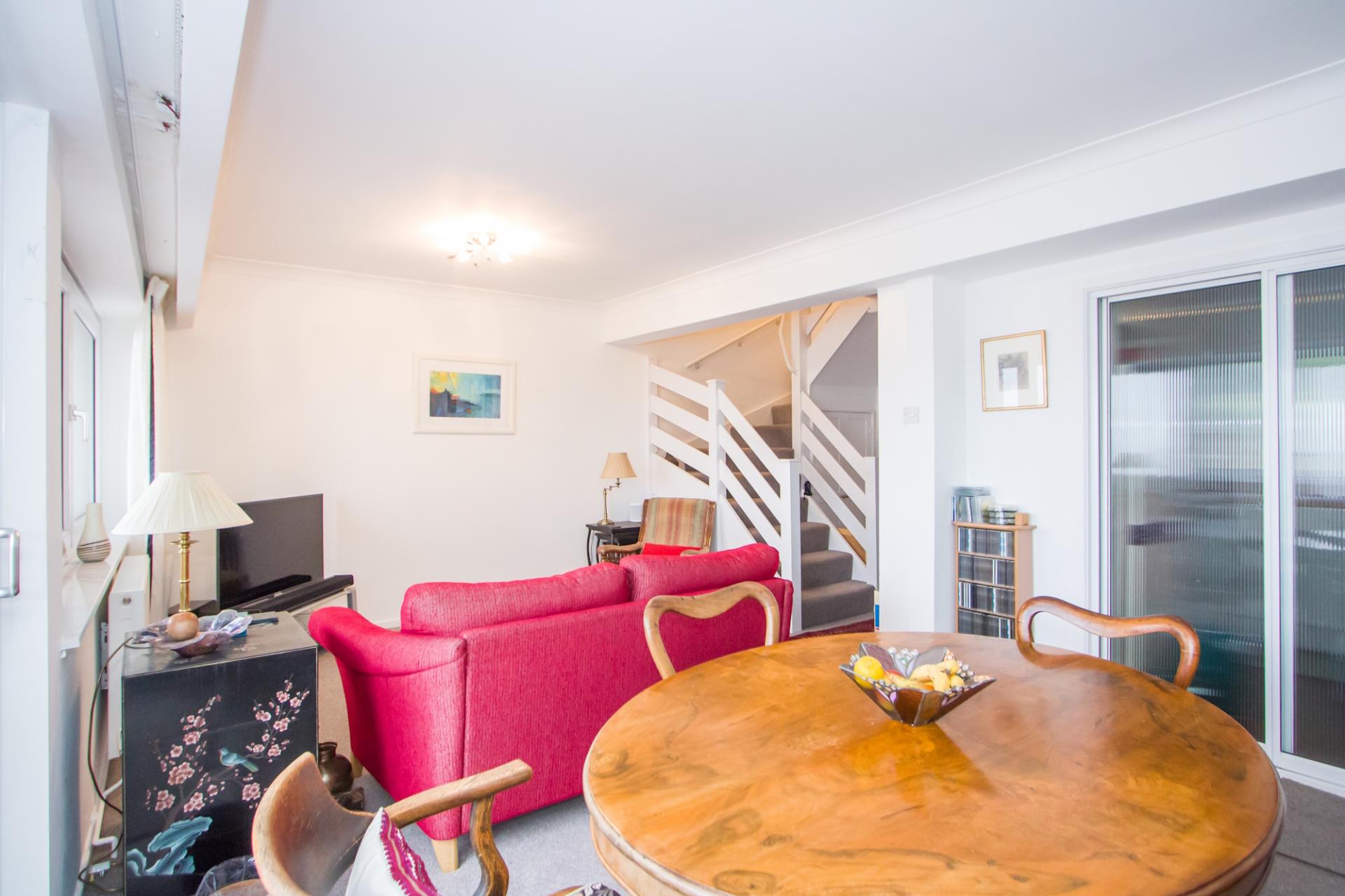 An open plan living and dining space with uPVC double glazed windows and sliding doors that offer very good water views over the Bristol Channel. Two central heating radiators. Power points and TV point stairs to the first floor. Access onto the balcony and a sliding door into the kitchen.