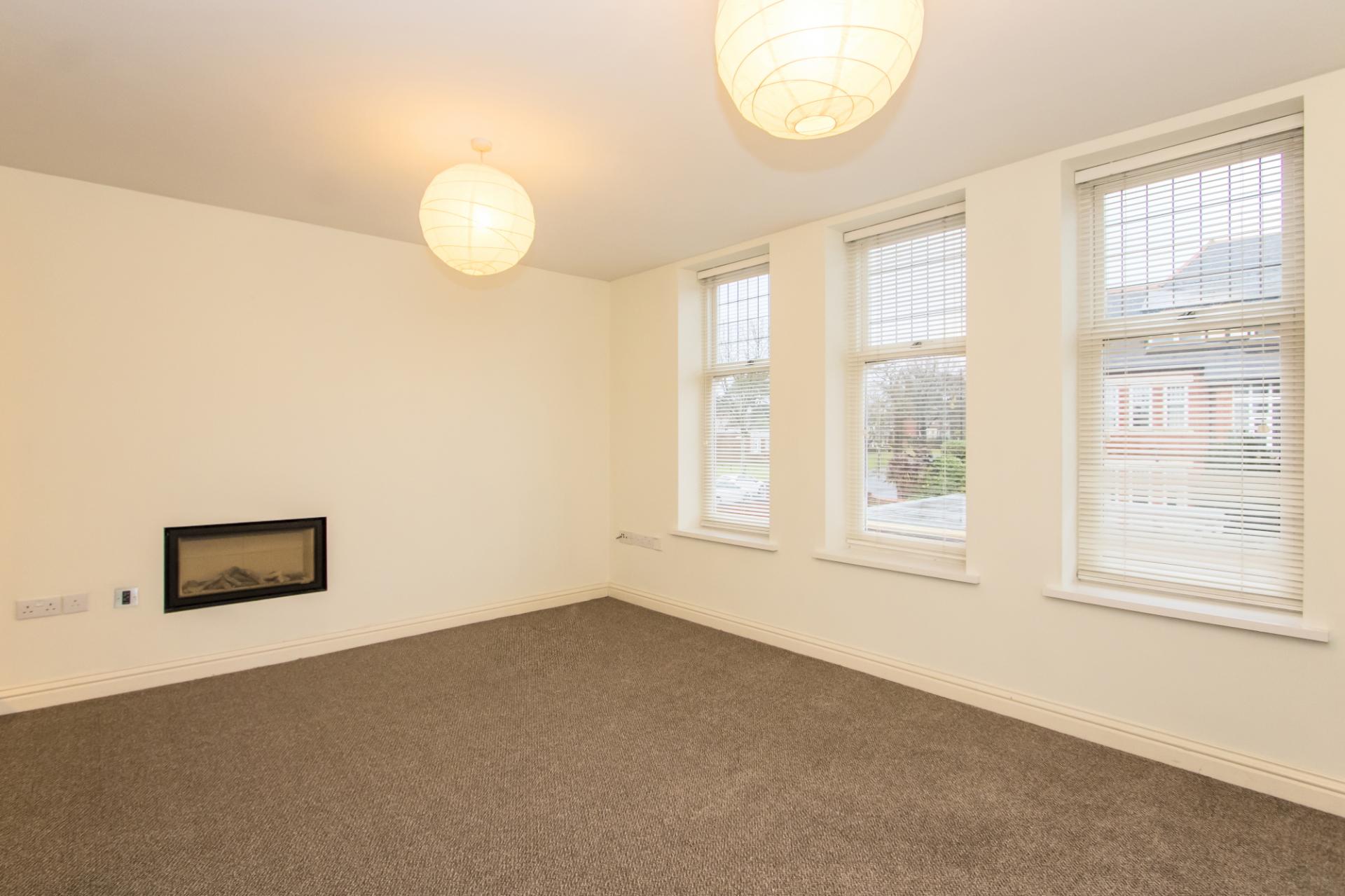 Three hardwood double glazed windows to the side and fitted Venetian blinds. New fitted carpet. TV, broadband and power points. Modern inset fireplace with gas fire. Open to the kitchen.
