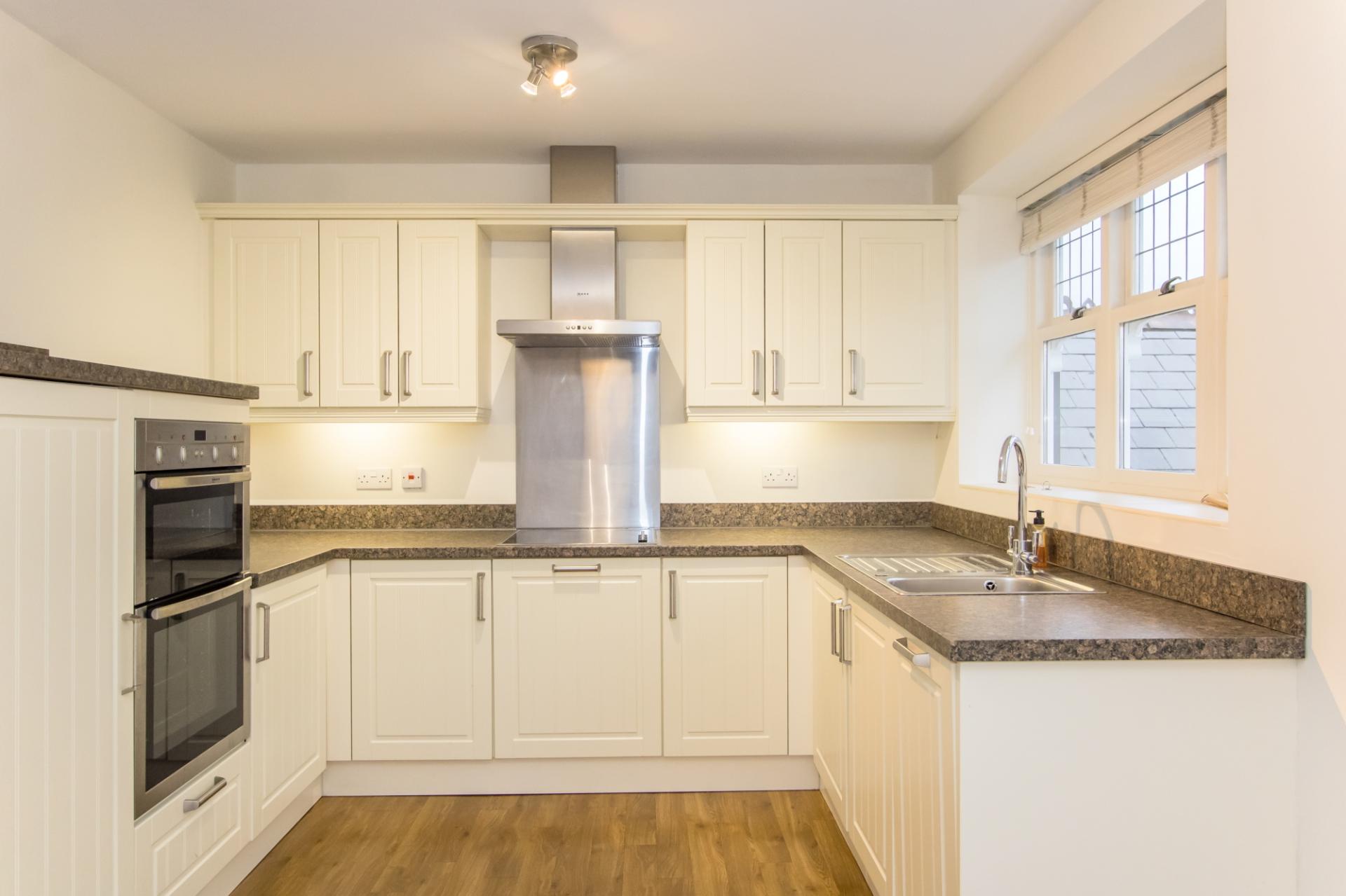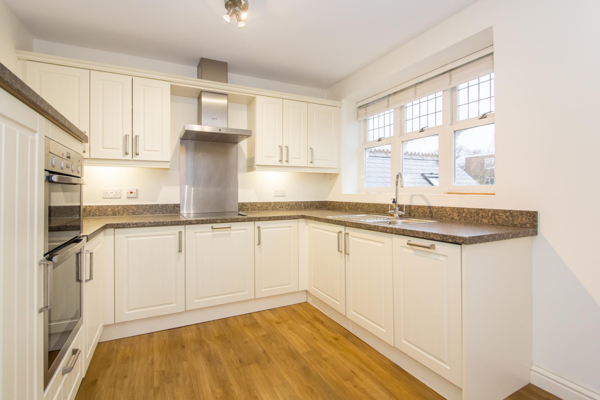 A quality Sigma 3 fitted kitchen with wall units, base units and laminate work surfaces with matching upstands. Neff appliances including an electric oven and grill, four zone electric hob with extractor hood over, fridge, freezer and dishwasher. Intgrated Baumatic dishwasher. Single bowl stainless steel stink with drainer. Power points. Three hardwood double glazed windows to the front. Laminate floor with under floor heating.