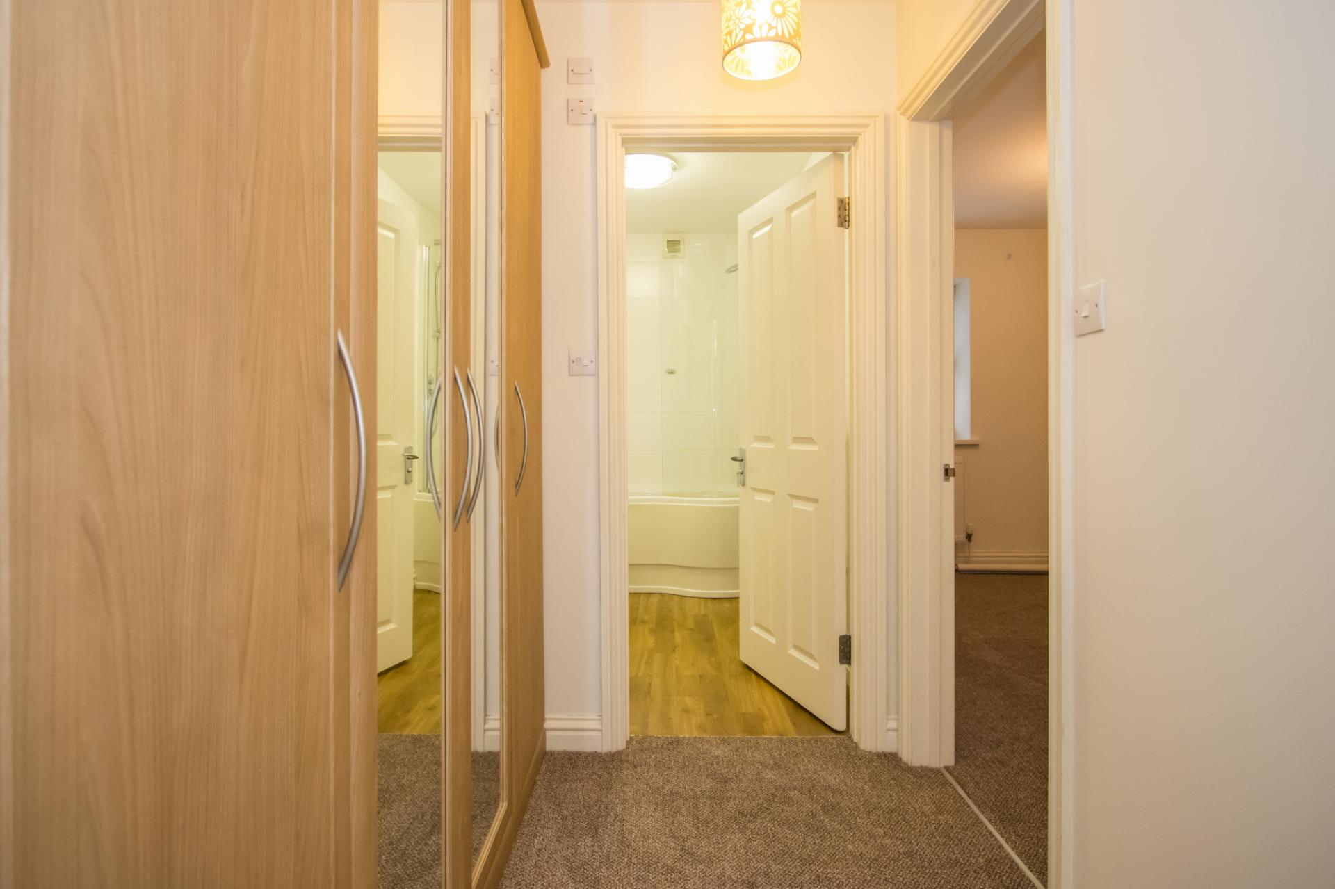 Fitted wardrobe containing the gas central heating boiler and providing generous storage. New fitted carpet. Door entry phone.