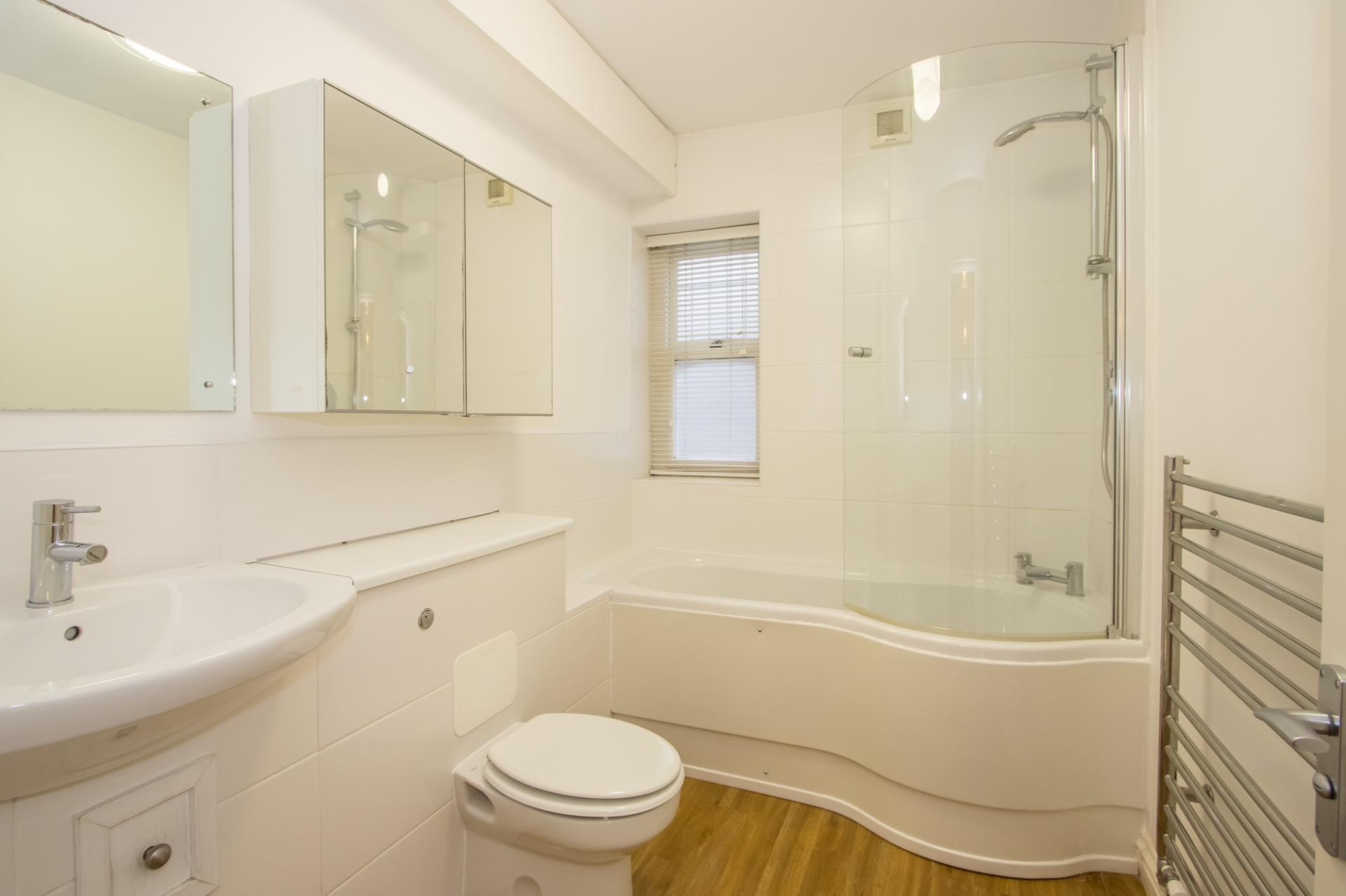 A spacious bathroom with a white suite comprising a curved, panelled bath with mixer shower, WC and wash hand basin. Laminate floor. Part tiled walls. Hardwood double glazed window. Extractor fan. Shaver point. Heated towel rail. Wall mounted cabinet and mirror.