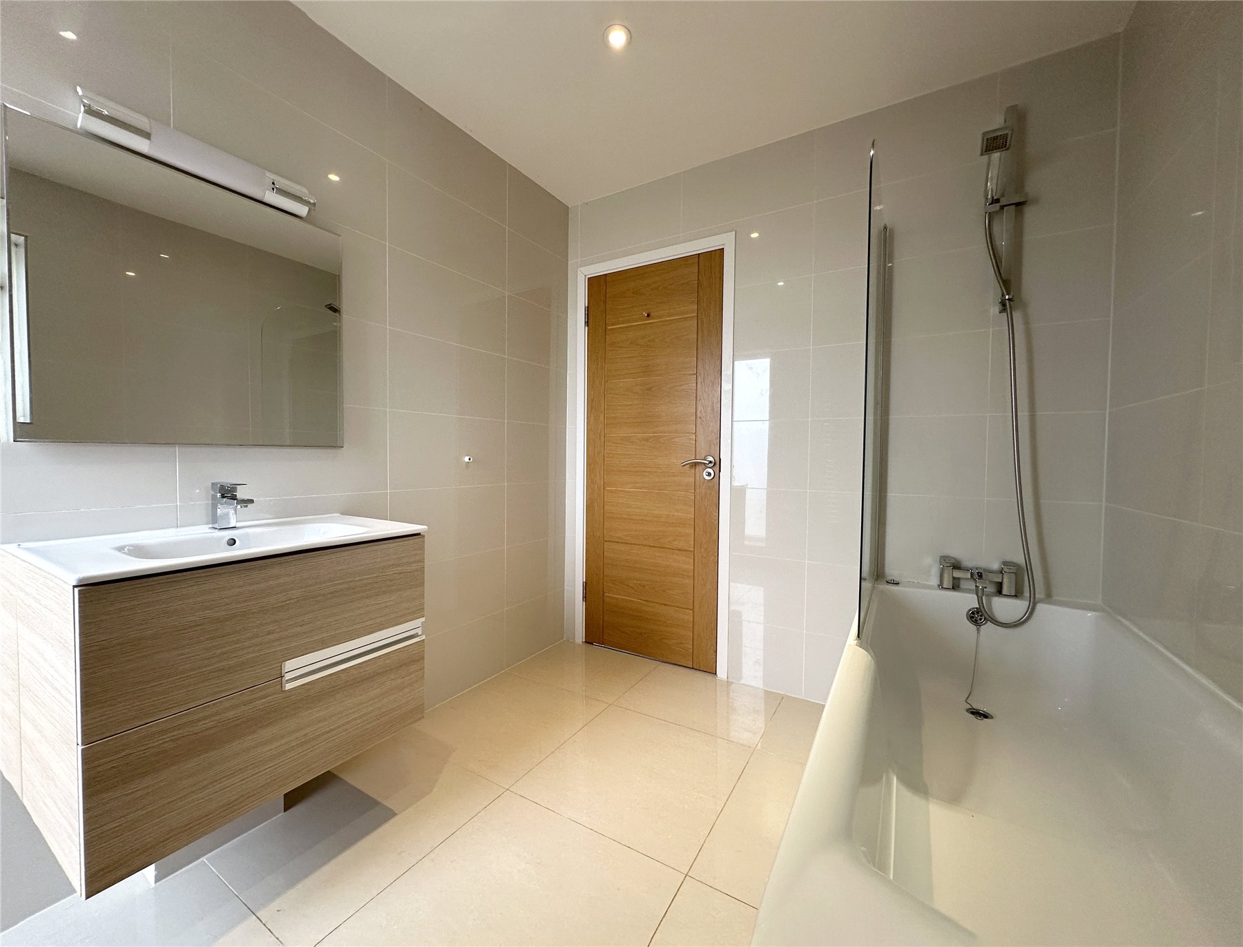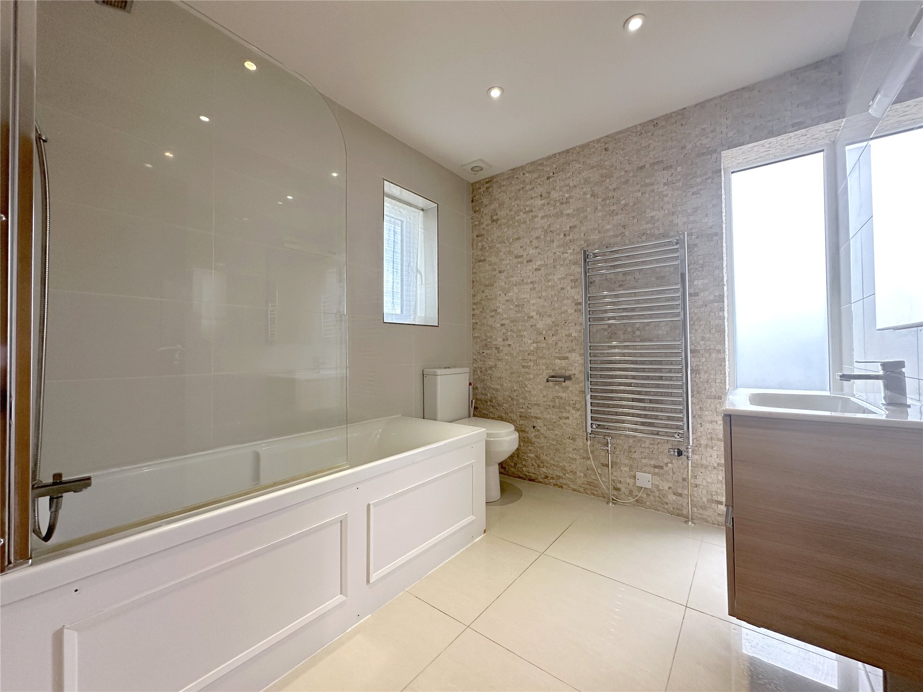 FAMILY BATHROOM White suite comprising of a paneled bath with chrome mixer tap and shower attachment over, wash basin in vanity unit, low level WC. Heated chrome towel rail and extractor. Tiled floor and walls with two double glazed windows.