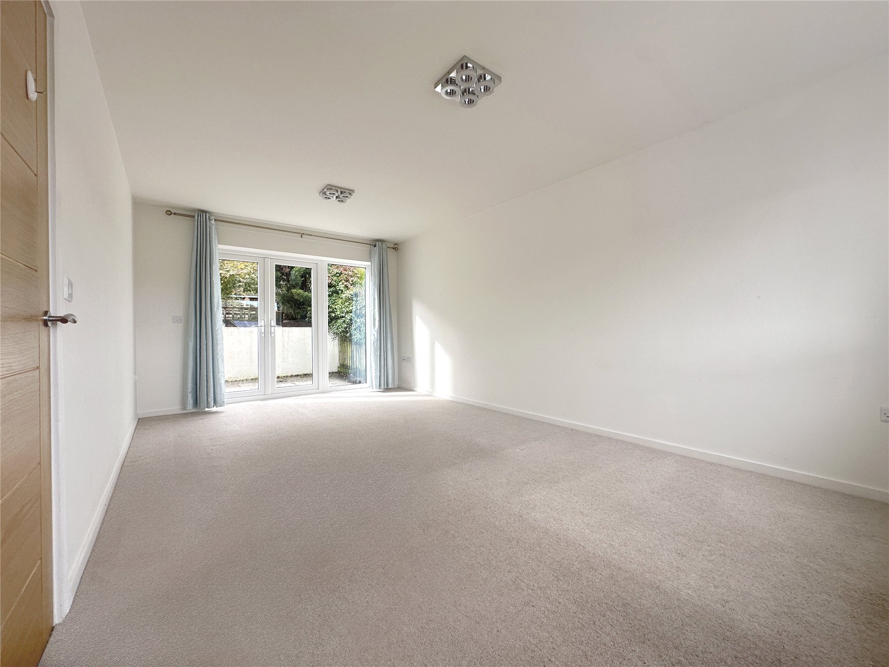 SITTING ROOM 18'3" x 10'10" (5.56m x 3.3m). Wide double glazed picture window to front with lovely views. Southerly facing double glazed double French doors with matching panel to one side to rear with view of the garden. Metal quad light fixtures to ceiling and ariel sockets to wall.