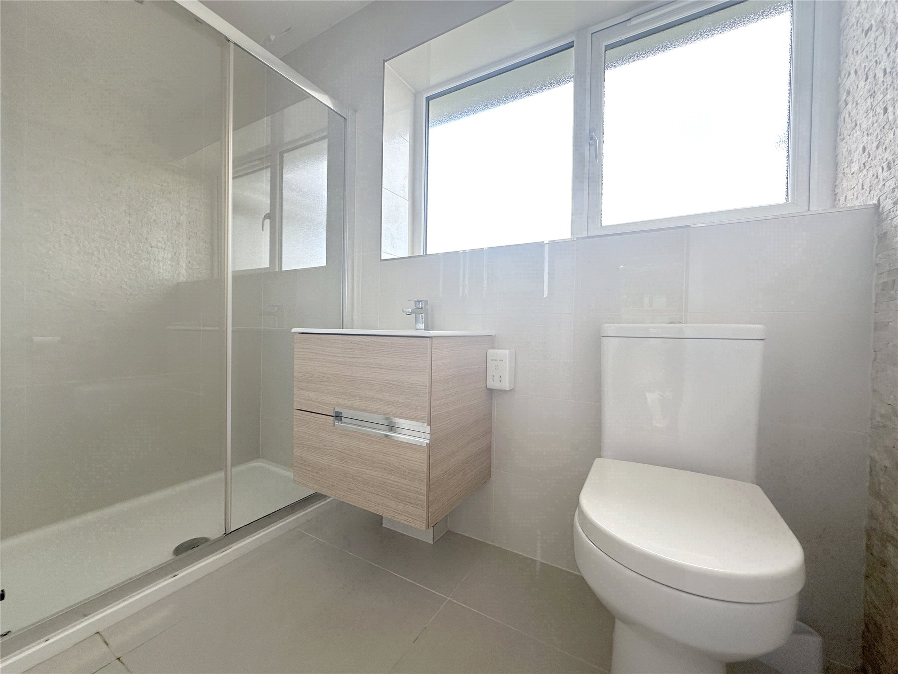 EN-SUITE BATHROOM 8'4" x 4'2" (2.54m x 1.27m). A white suite comprising of a double shower cubicle with large shower head above and extendable shower below. Wash basin in vanity unit, low level WC and low level electric shaver point. Heated chrome towel rail, extractor and tiled floor to wall with double glazed frosted window.