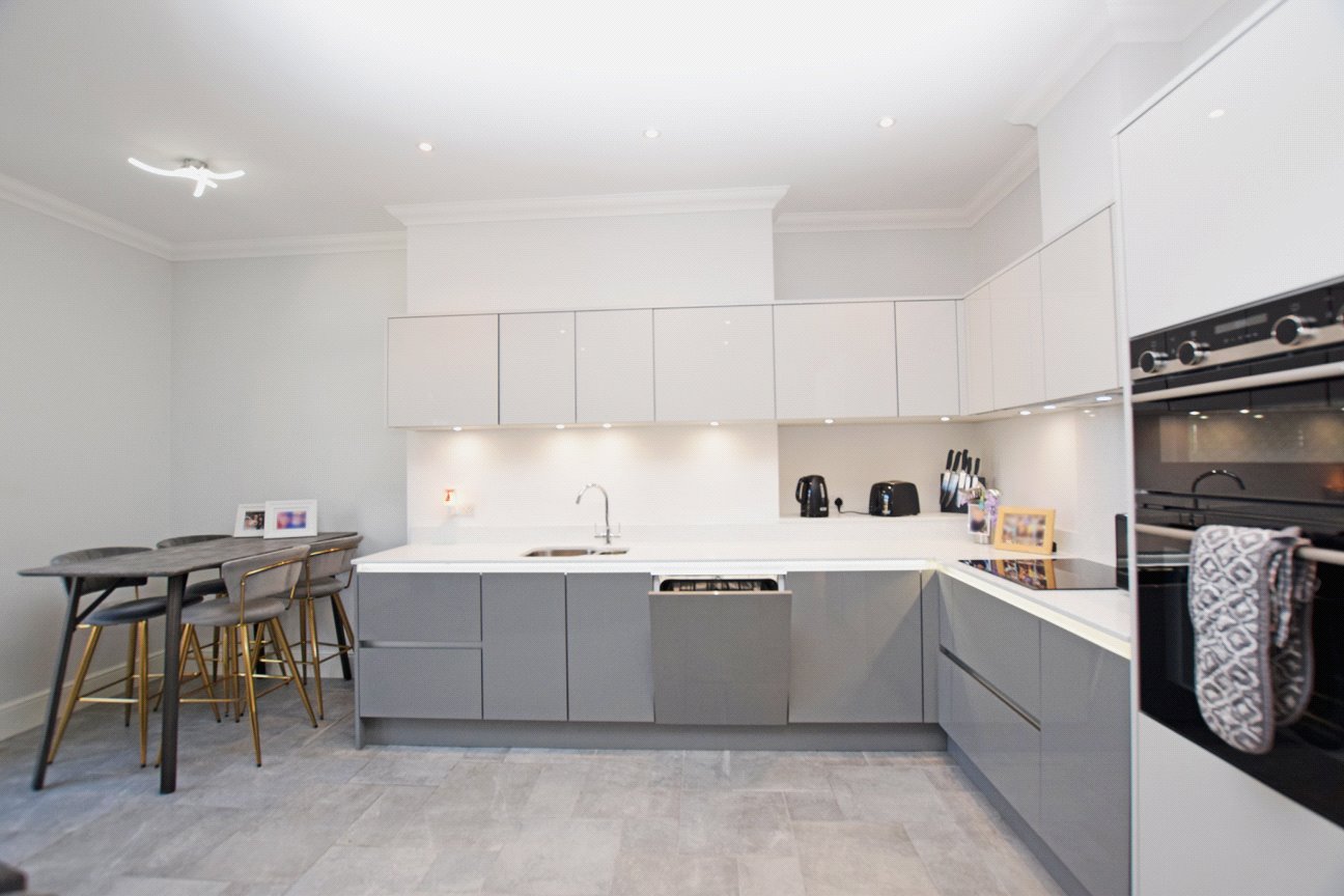 OPEN PLAN KITCHEN/ SITTING ROOM 19'2" x 17'2" (5.84m x 5.23m). Modern kitchen with floor and wall mounted cupboards and drawer unit. Sink with drainer and mixer tap over. Four ring electric hob with extractor over and built in oven. Integrated fridge/freezer and dishwasher. Window to the rear aspect and doors out to the garden. Underfloor heating.