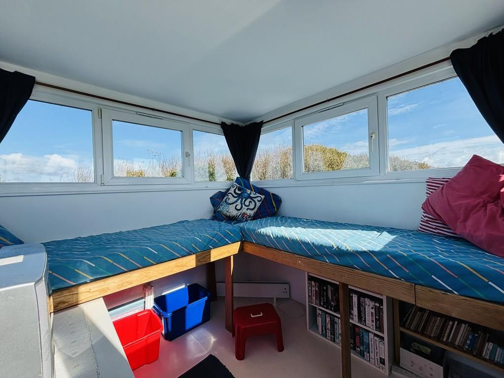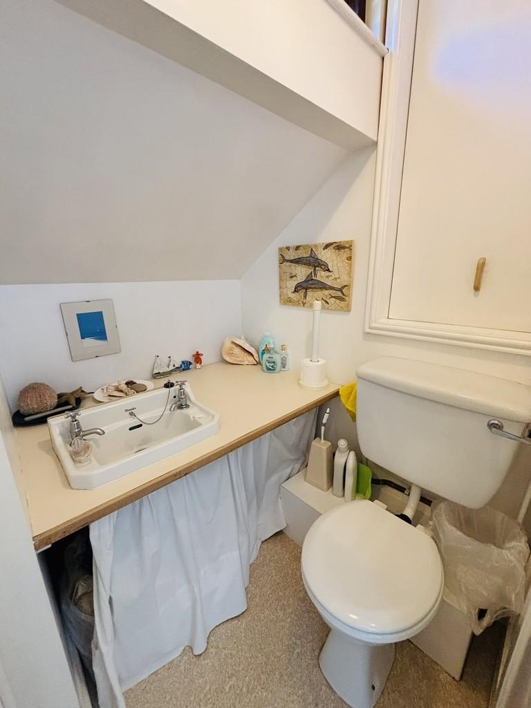 On the upper level, you will find two double bedrooms offering lovely sea views. The bathroom features a shower over the bath, a low-level WC, a wash hand basin, and an additional separate WC. A staircase leads to a reception/viewing room that also boasts direct sea views.