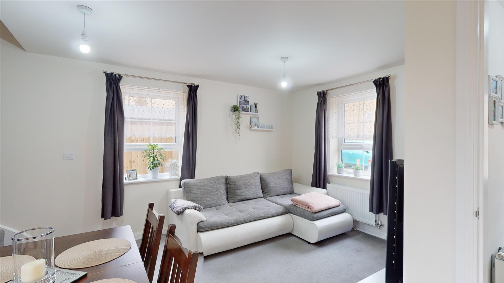 The property includes: entrance hall, with cloakroom off, through to a large open-plan living/ dining/kitchen room, with space for appliances and access to the rear garden. The staircase leads to a landing with storage cupboards off, as well as a master bedroom, also with built-in storage, a second bedroom and a shower room. Outside there is an enclosed rear garden and 2 allocated parking spaces directly to the front of the property. The house is tucked away off Aqua Drive and offers a pleasant discrete location away from passing traffic.