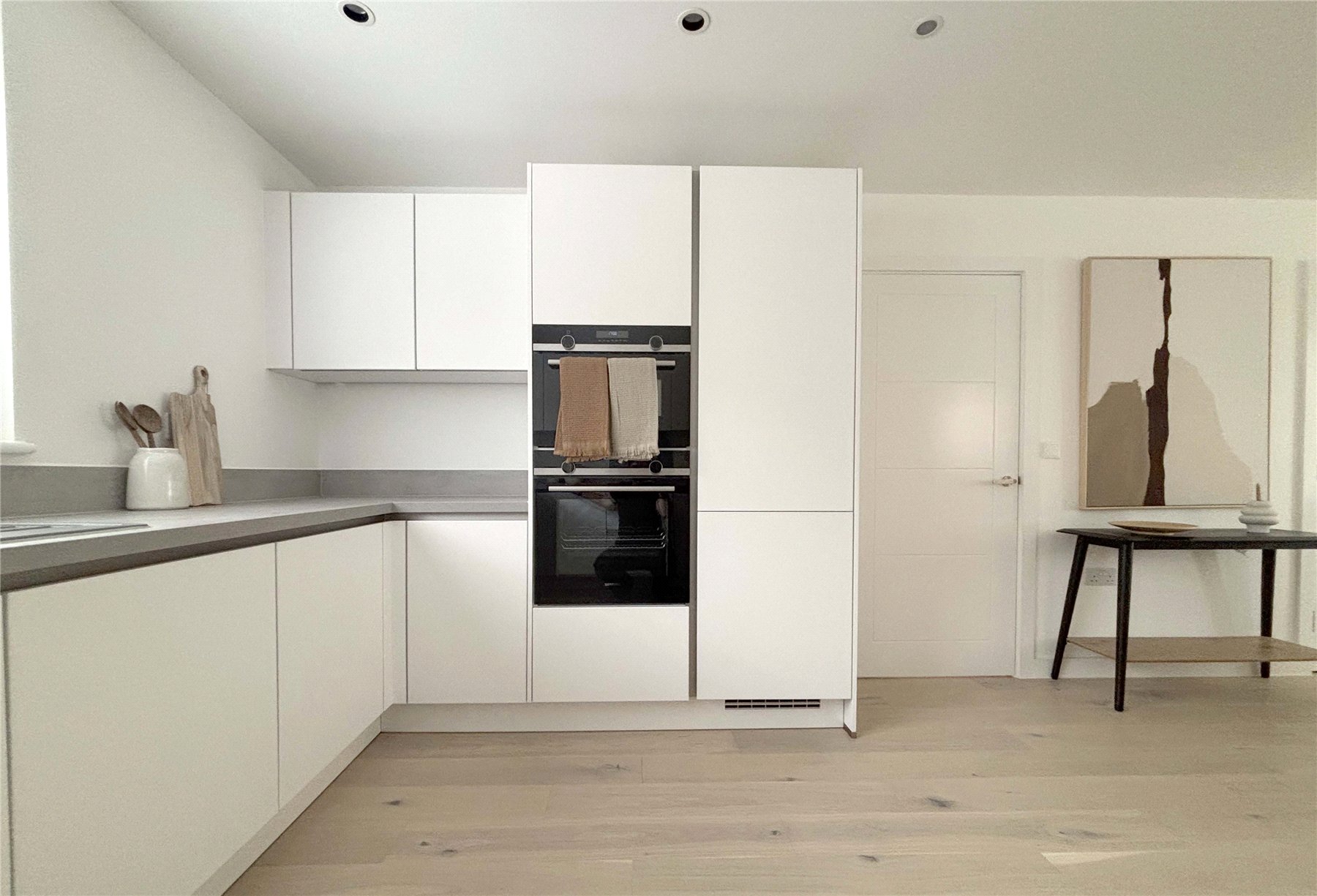 KITCHEN 11'6" x 10' (3.5m x 3.05m). With a range for floor and wall mounted, matte white, soft close cupboards and drawers. Grey inset sink with drainer and stainless-steel mixer tap. Integrated Siemens appliances, Dishwasher, fridge/freezer, oven, microwave and induction hob. Large triple-glazed windows overlooking the garden. Door leading into: