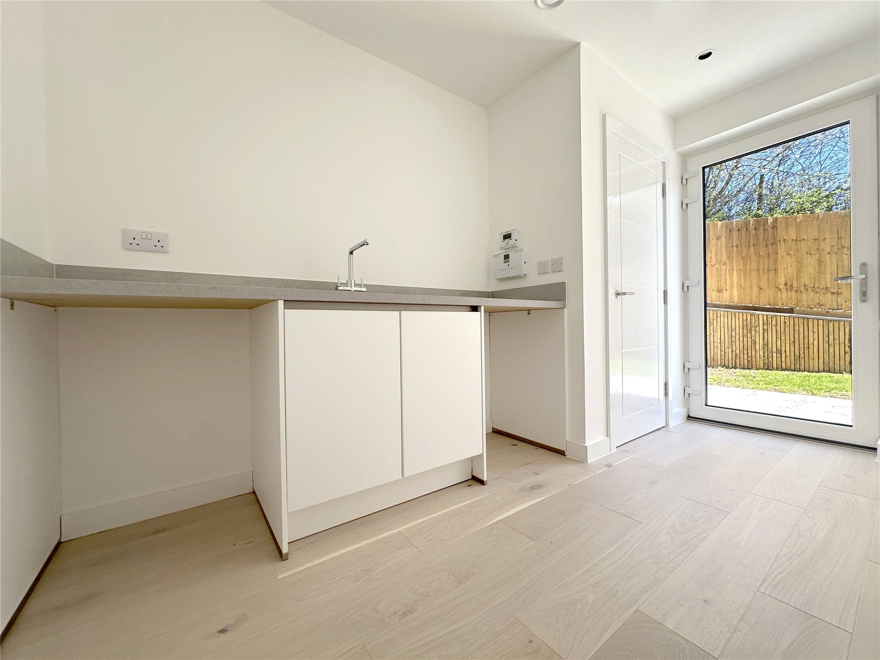 UTILITY ROOM Floor mounted, matte white, soft close cupboard with space and plumbing for washing machine and tumble dryer. Inset sink with stainless steel mixer tap. Cupboard housing the water tank and heat pump. Door leading to: