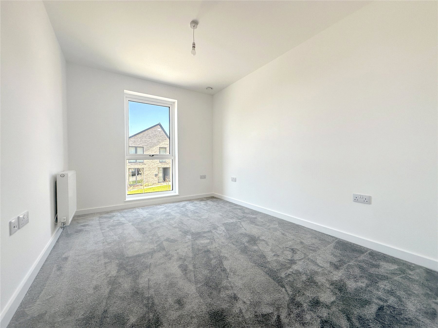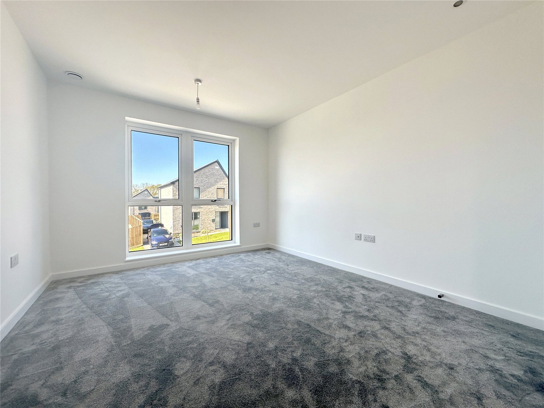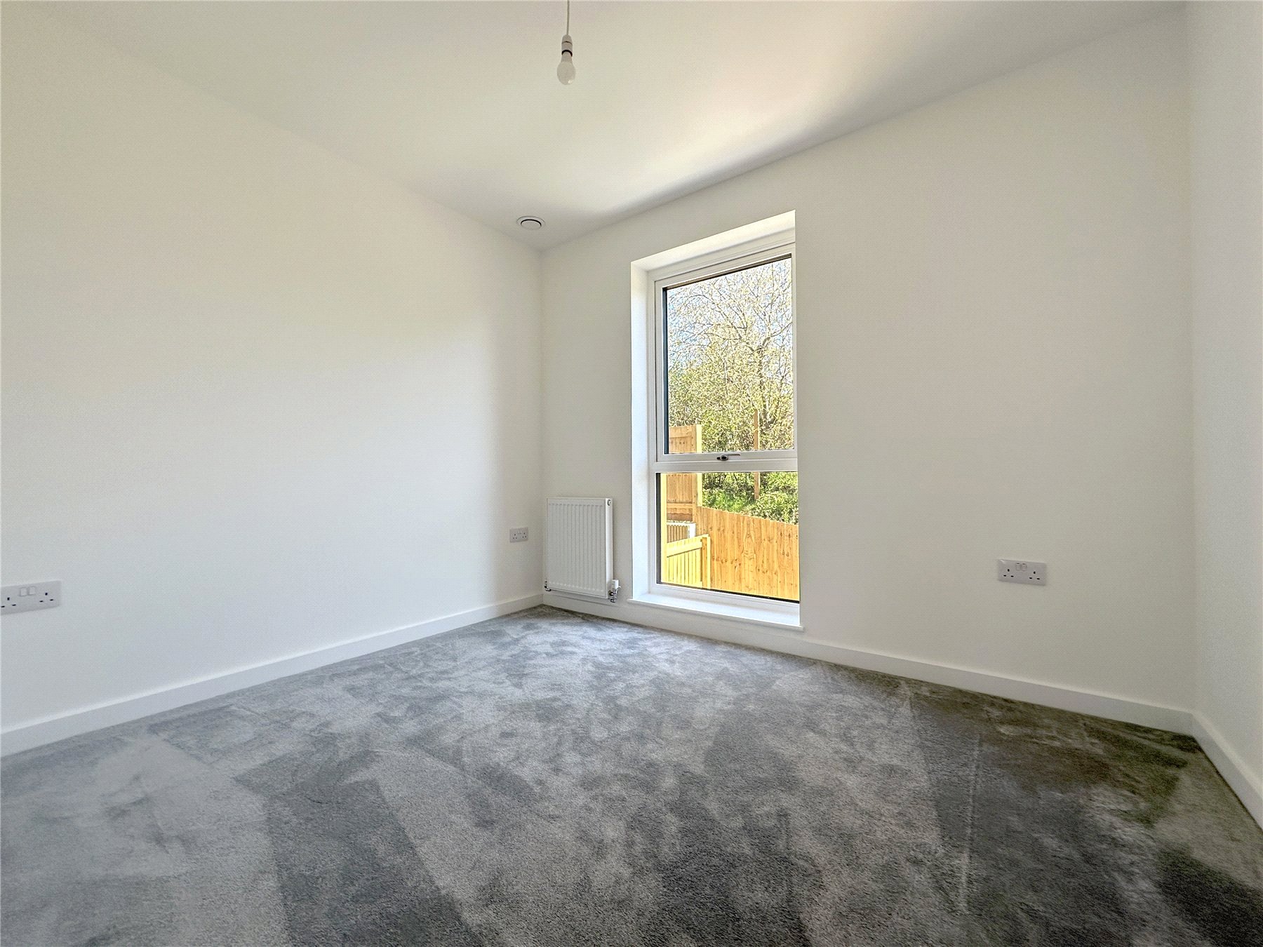 BEDROOM TWO 8'10" x 12'2" (2.7m x 3.7m). Double room with one full-length triple-glazed window to the front. Plush grey carpet. Radiator. Sockets. TV and Telephone point.