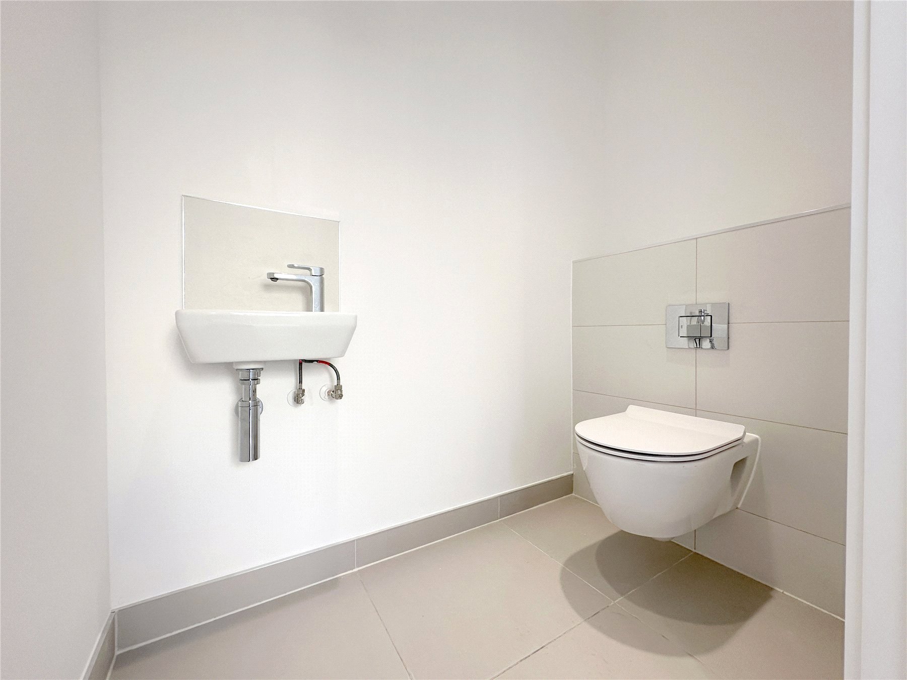 CLOAKROOM Low level wall hung toilet with push flush. White basin with mixer taps. Radiator.