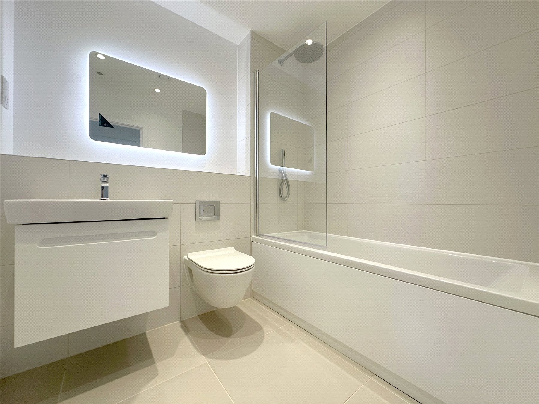 BATHROOM Modern style bath with tiled surround and shower over, large shower head with separate handheld shower. Low level wall hung toilet with push flush. White basin with mixer taps and drawer underneath. Touch screen light up, heated mirror. Heated towel rail.