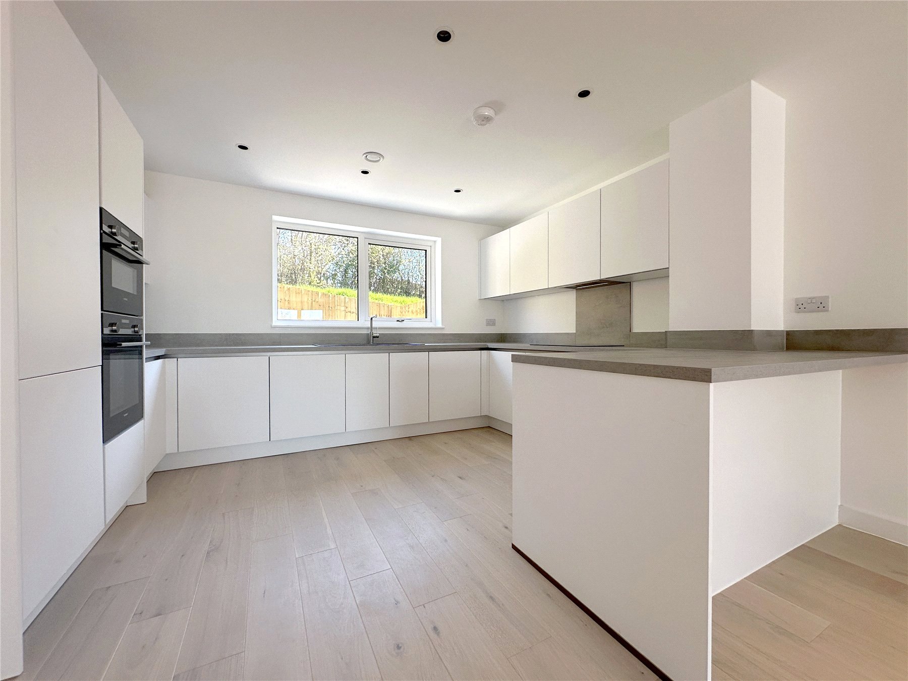 KITCHEN 11'6" x 10' (3.5m x 3.05m). With a range for floor and wall mounted, matte white, soft close cupboards and drawers. Grey inset sink with drainer and stainless-steel mixer tap. Integrated Siemens appliances, Dishwasher, fridge/freezer, oven, microwave and induction hob. Large triple-glazed windows overlooking the garden. Door leading into: