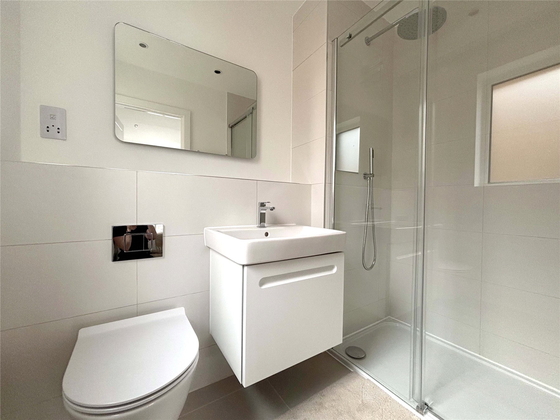ENSUITE Double step in cubicle shower with large shower head and separate handheld shower. Low level wall hung toilet with push flush. White basin with mixer taps and drawer underneath. Touch screen light up, heated mirror. Heated towel rail.