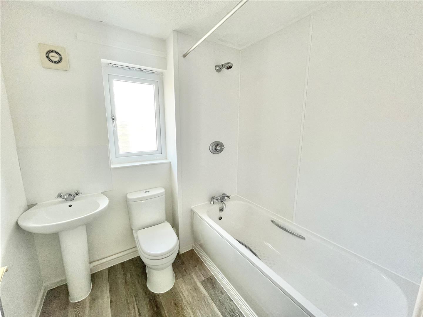 Bathroom - 2.09 x 1.91 (6'10" x 6'3") - White modern suite comprising a panel bath, pedestal wash basin and a low level toilet. Double-glazed window to the front elevation.