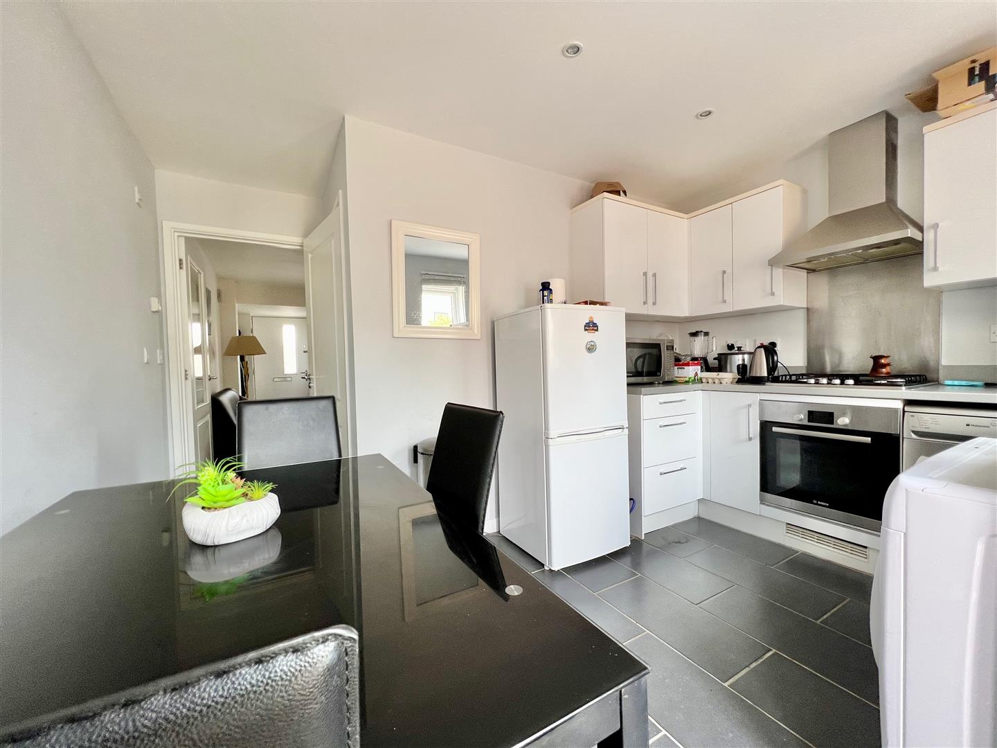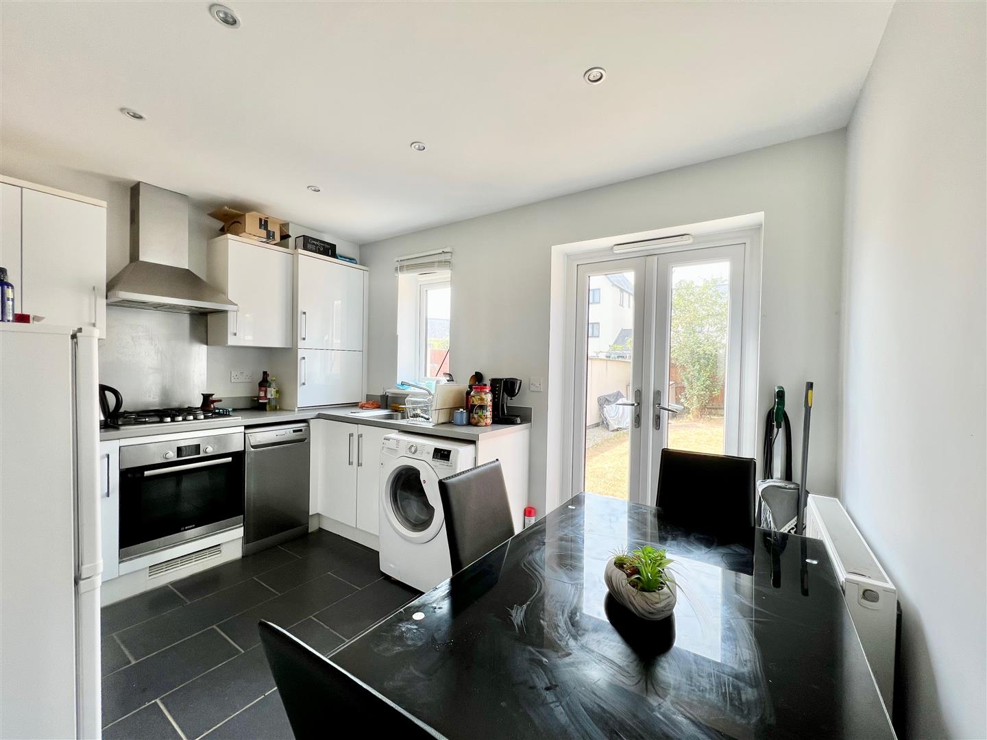 Kitchen/Dining Room - 3.63m x 2.67m (11'11 x 8'9) - Tiled floor throughout. Spotlighting. Window to the rear elevation. French windows opening onto the garden. Space for table and chairs. Base and wall-mounted cabinets with matching fascias, work surfaces and splash-backs. Stainless-steel single-drainer sink unit. Built-in oven and hob with a stainless-steel splash-back and cooker hood. Space and plumbing for a slimline dishwasher. Space and plumbing for washing machine. Space for free-standing fridge/freezer.