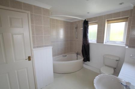 Bathroom - 9' 8" x 8' 3" (2.97m x 2.52m) - White suite comprising corner bath with mixer tap and spray attachment, pedestal wash handbasin and low-level toilet. Tiling to all walls with wood panelling beneath. Built-in cupboard housing the gas boiler. Airing cupboard space. Loft hatch.