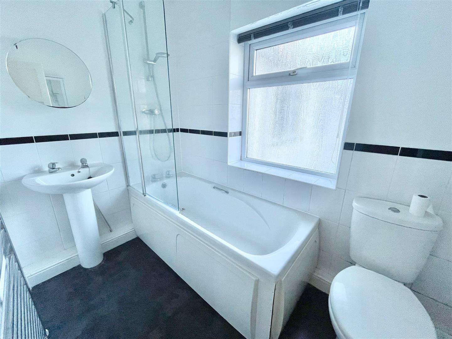 Bathroom - 2.55 x 1.54 (8'4" x 5'0") - White suite comprising a panel bath with tiled area surround, twin handgrips, shower screen and shower unit with spray attachment, pedestal wash basin and a low level toilet. Vertical towel rail/radiator. Obscured double-glazed window to the side elevation.