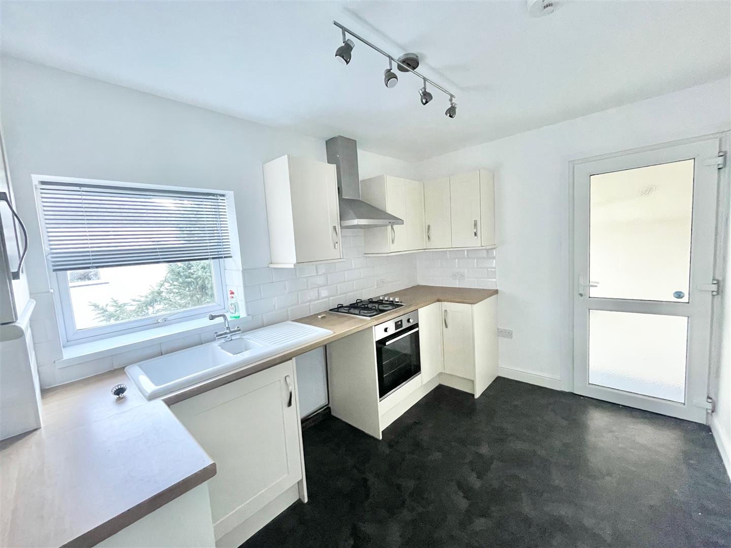 Kitchen - 3.52 x 2.47 (11'6" x 8'1") - Range of matching eye-level and base units with rolled-edge work surfaces and tiled splash-backs. Inset one-&-a-half bowl sink unit with mixer tap. Built-in 4-ring gas hob with an electric oven beneath. Space for washing machine. Space for fridge-freezer. uPVC double-glazed door leading to a rear passage.