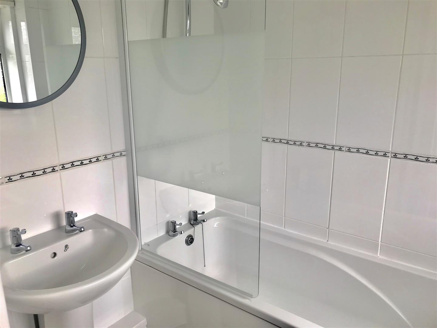 Bathroom - 2.03 x 1.50 (6'7" x 4'11") - White modern suite including pedestal wash hand basin, low level toilet and a panel bath with shower screen and a shower unit with spray attachment over. Tiled walls. Obscured double-glazed window to the side elevation.