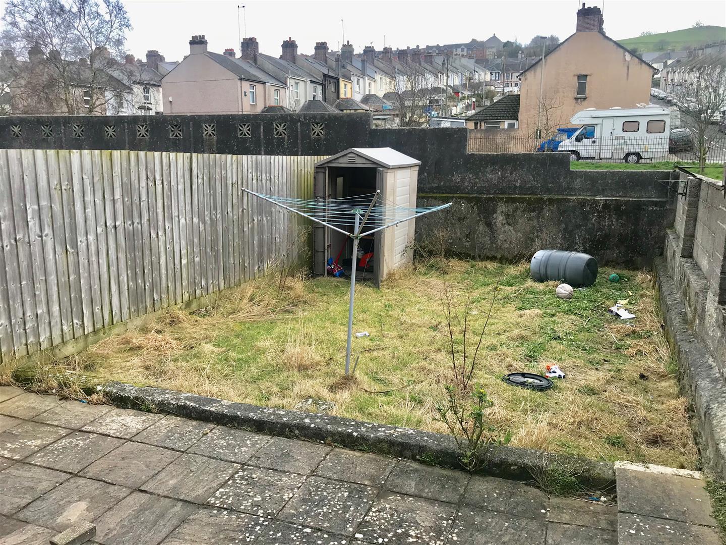 Outside - Access via the cobbled lane, the property is located on the left hand side where there is one small parking space. A pathway and steps lead down to the rear garden which is enclosed by timber fencing and block walling. There is a paved area adjacent to the property along with an uncultivated lawn.