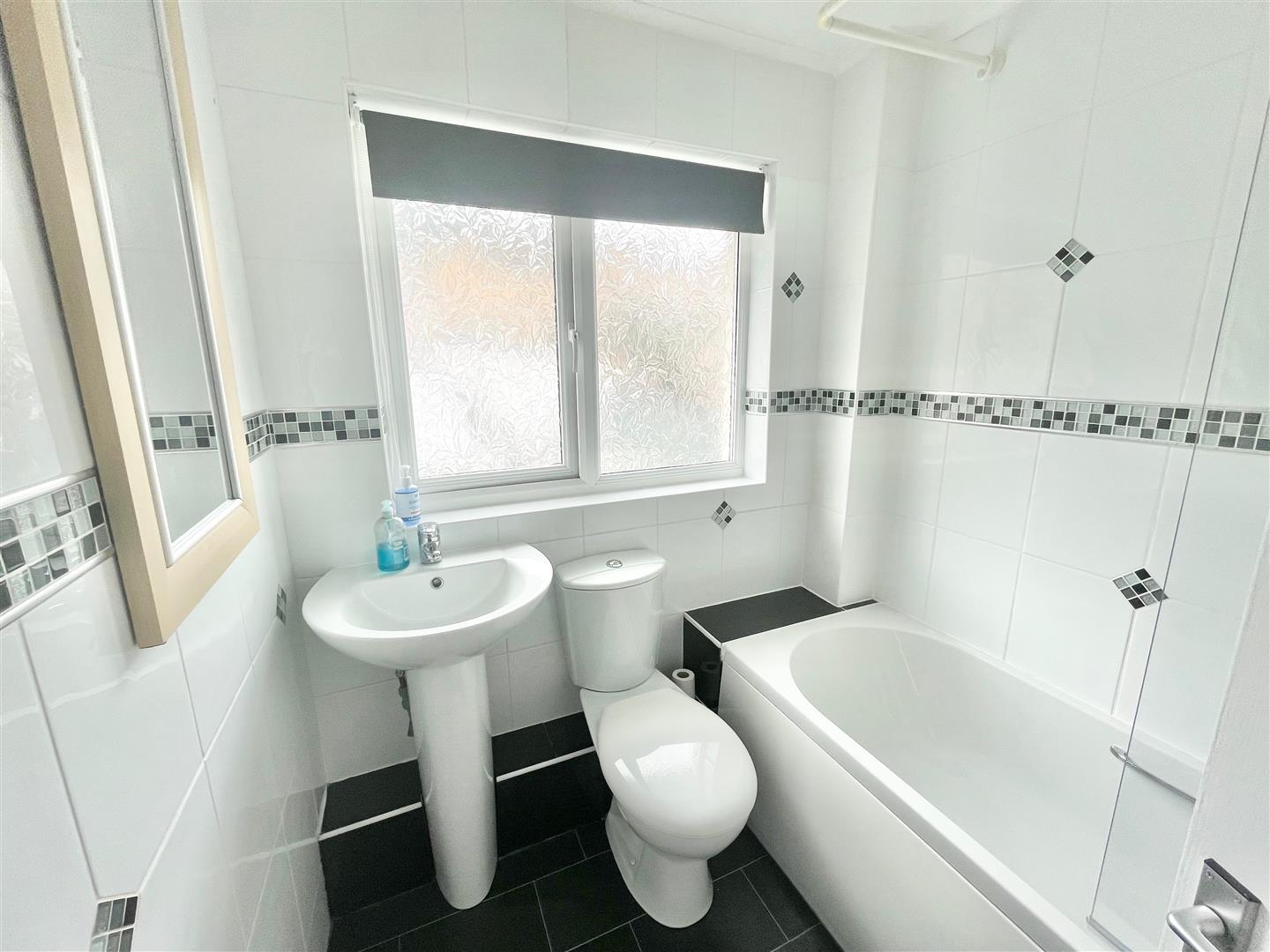 Bathroom - 1.90 x 1.80 (6'2" x 5'10") - White modern suite including bath with shower unit, spray attachment and shower screen over, low-level toilet and wash handbasin with mixer tap. Tiled from floor to ceiling. Vertical towel rail/radiator. Obscured double-glazed window to the rear. elevation.