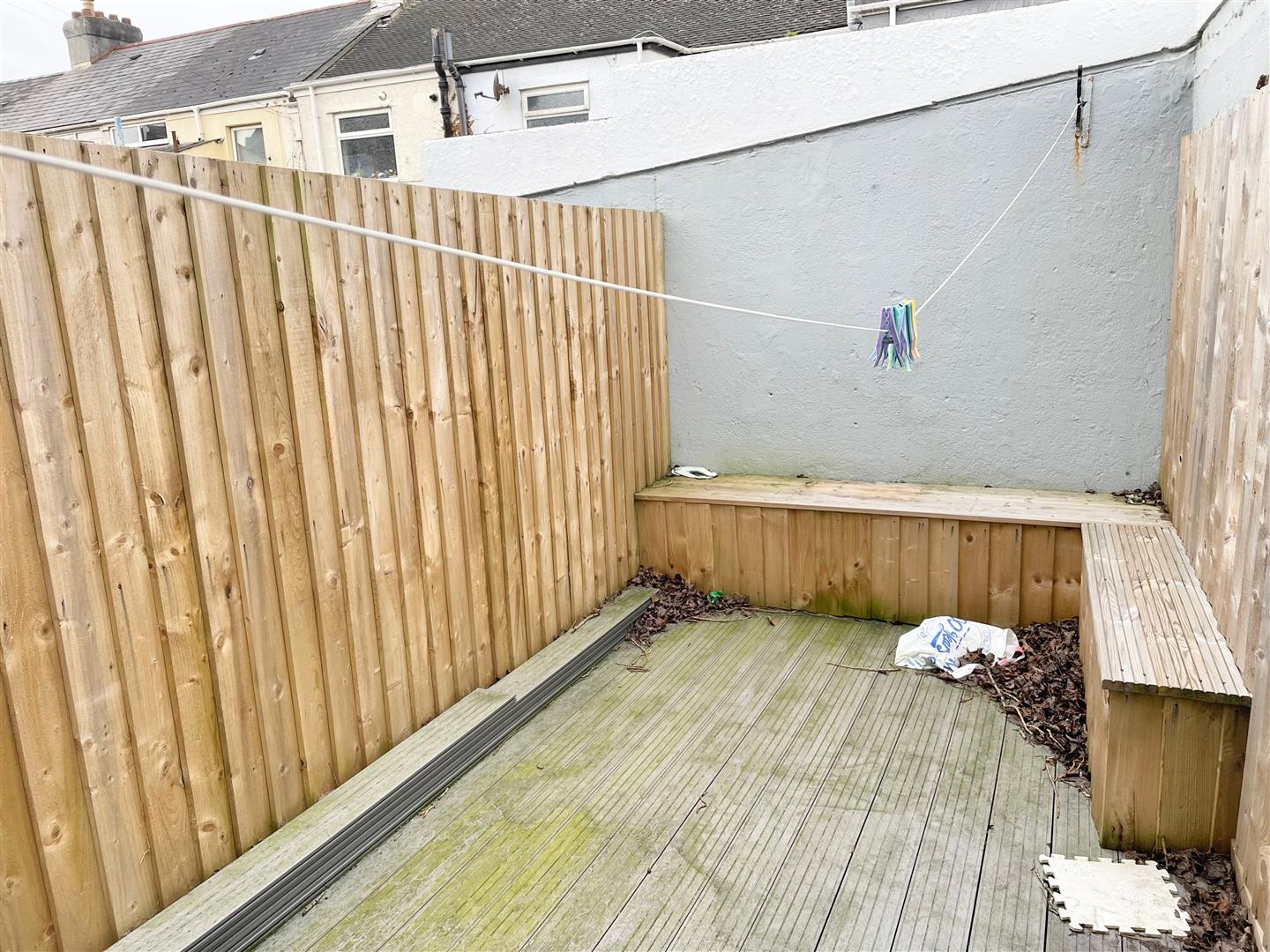 Outside - Accessed from the double doors is a shared passage with steps down to an enclosed decked courtyard area. A side gate provides access out onto the road.