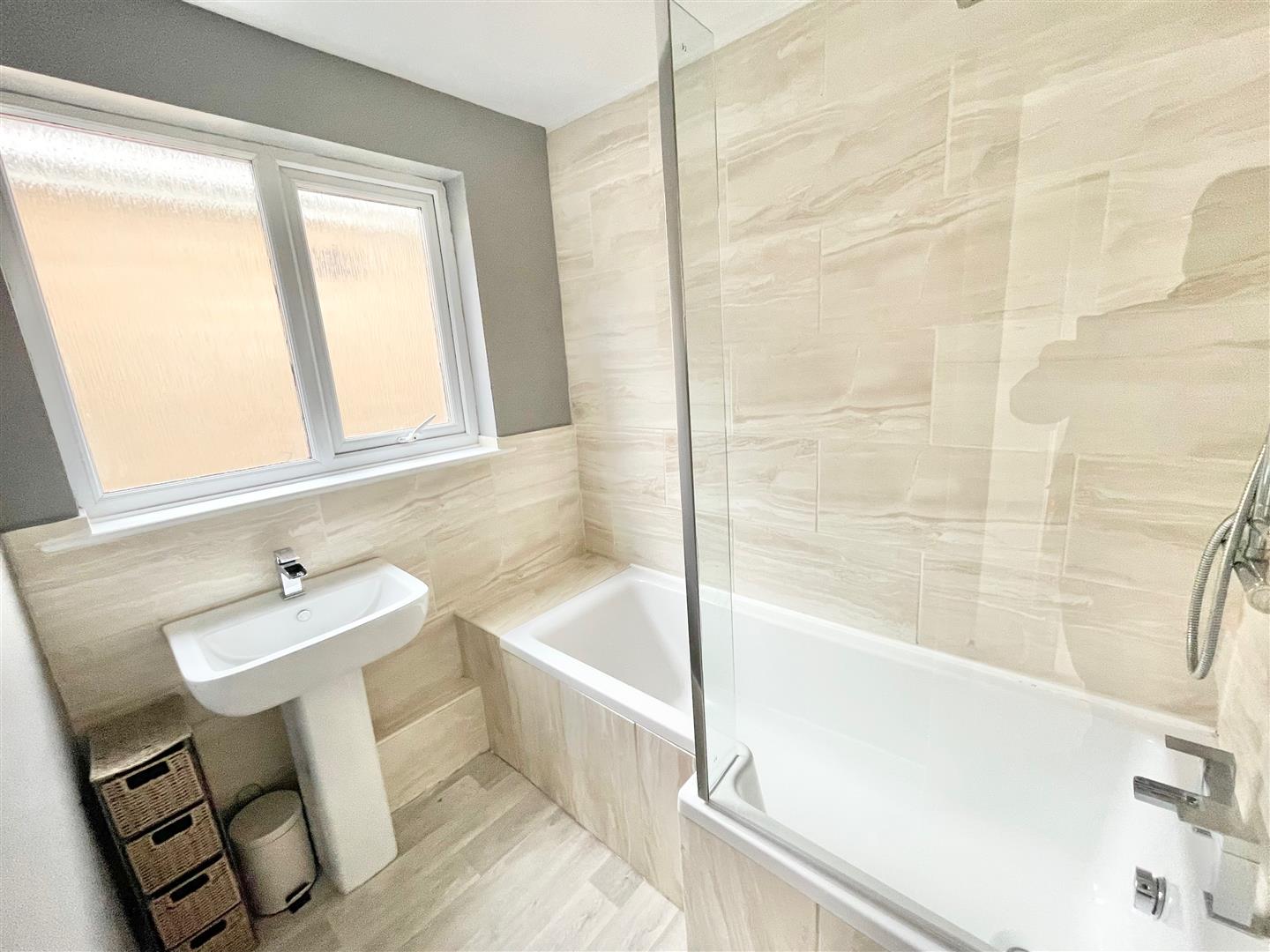 Bathroom - 2.29 x 1.67 (7'6" x 5'5") - Comprising a 'P-shaped' bath with a mixer tap, shower unit with spray attachment over and a shower screen and a pedestal wash basin with mixer tap.Vertical towel rail/radiator. Obscured double-glazed window to the rear elevation.