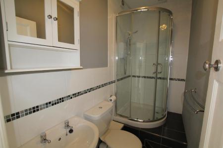 Shower Room - 4' 11" x 3' 11" (1.52m x 1.20m) - White modern suite comprising shower unit with tiled area surround, shower unit and spray attachment, pedestal wash handbasin and low-level wc.