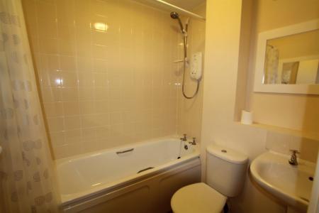 Bathroom - 6' 4" x 5' 2" (1.95m x 1.59m) - White modern suite comprising panel bath with shower unit and spray attachment above and tiled surround, pedestal wash handbasin and low-level toilet. Built-in extractor fan.
