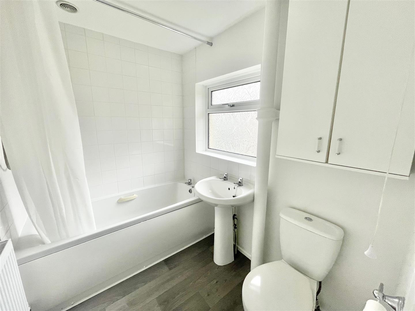Bathroom - 2.19 x 1.70 (7'2" x 5'6") - Fitted with a modern white suite comprising panel bath with twin handgrips, shower unit with spray attachment over the bath with tiled area surround, pedestal wash handbasin and low-level toilet. Obscured double-glazed window to the rear.