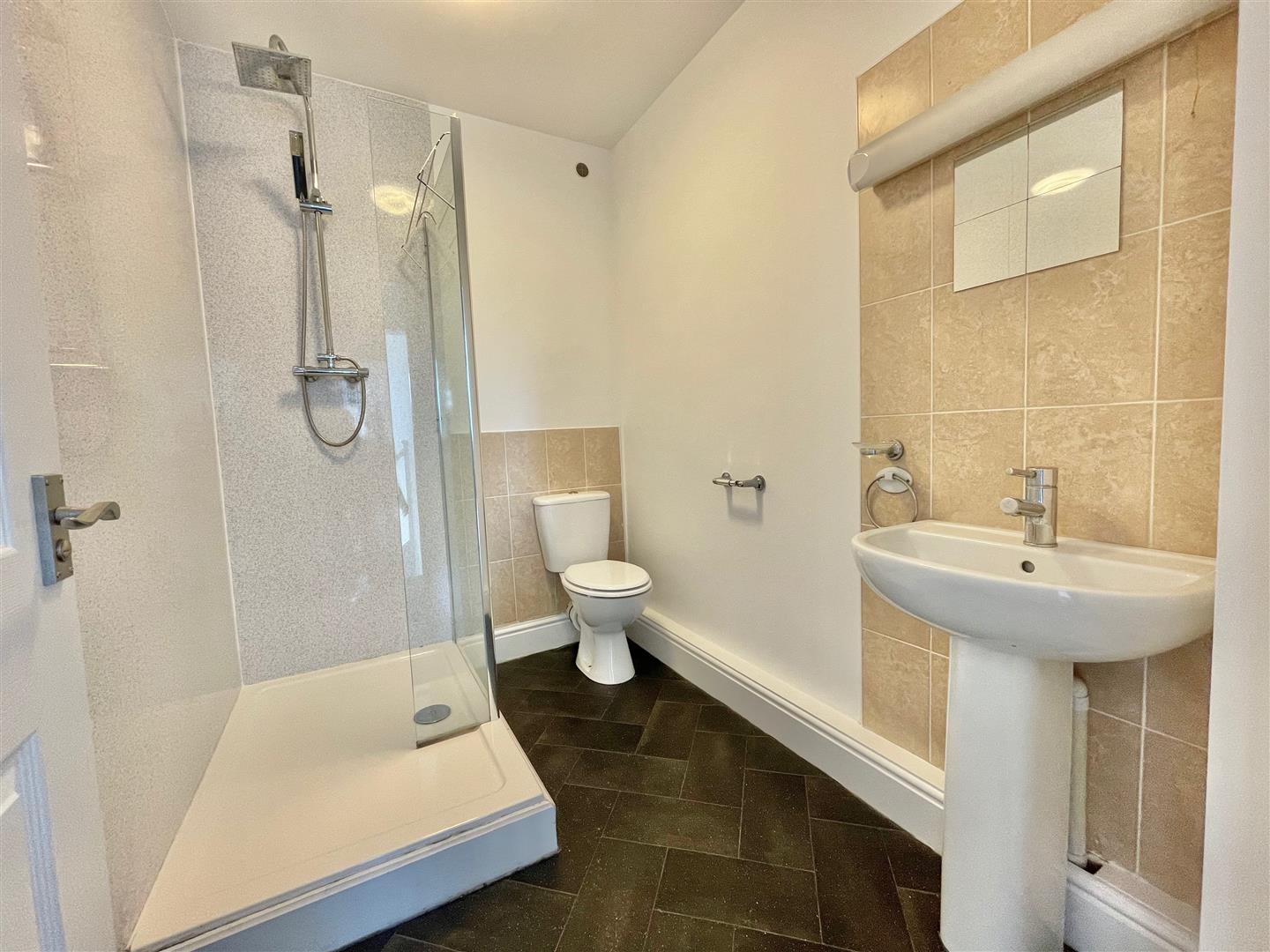 Shower Room - 2.38 x 1.70 (7'9" x 5'6") - White modern suite comprising walk-in shower cubicle with shower unit and spray attachment, sink unit with mixer tap and a low level toilet. Radiator.