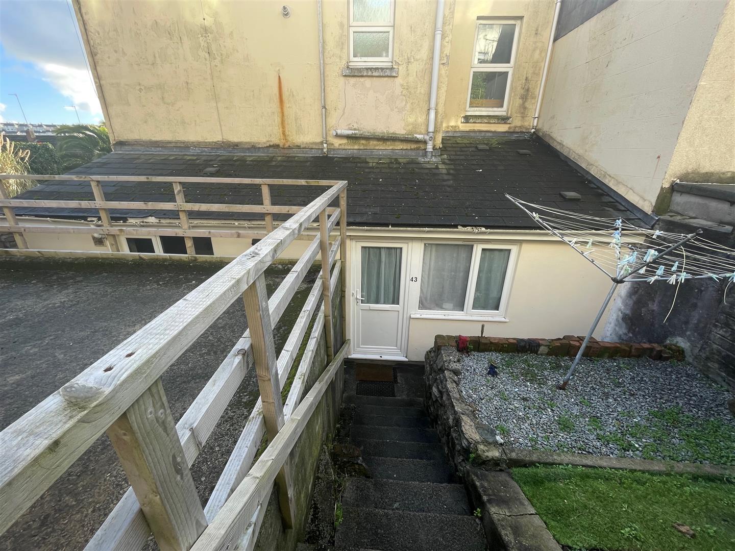 Outside - Gravelled area to the front of the property with a washing line. Steps lead up to the parking space.