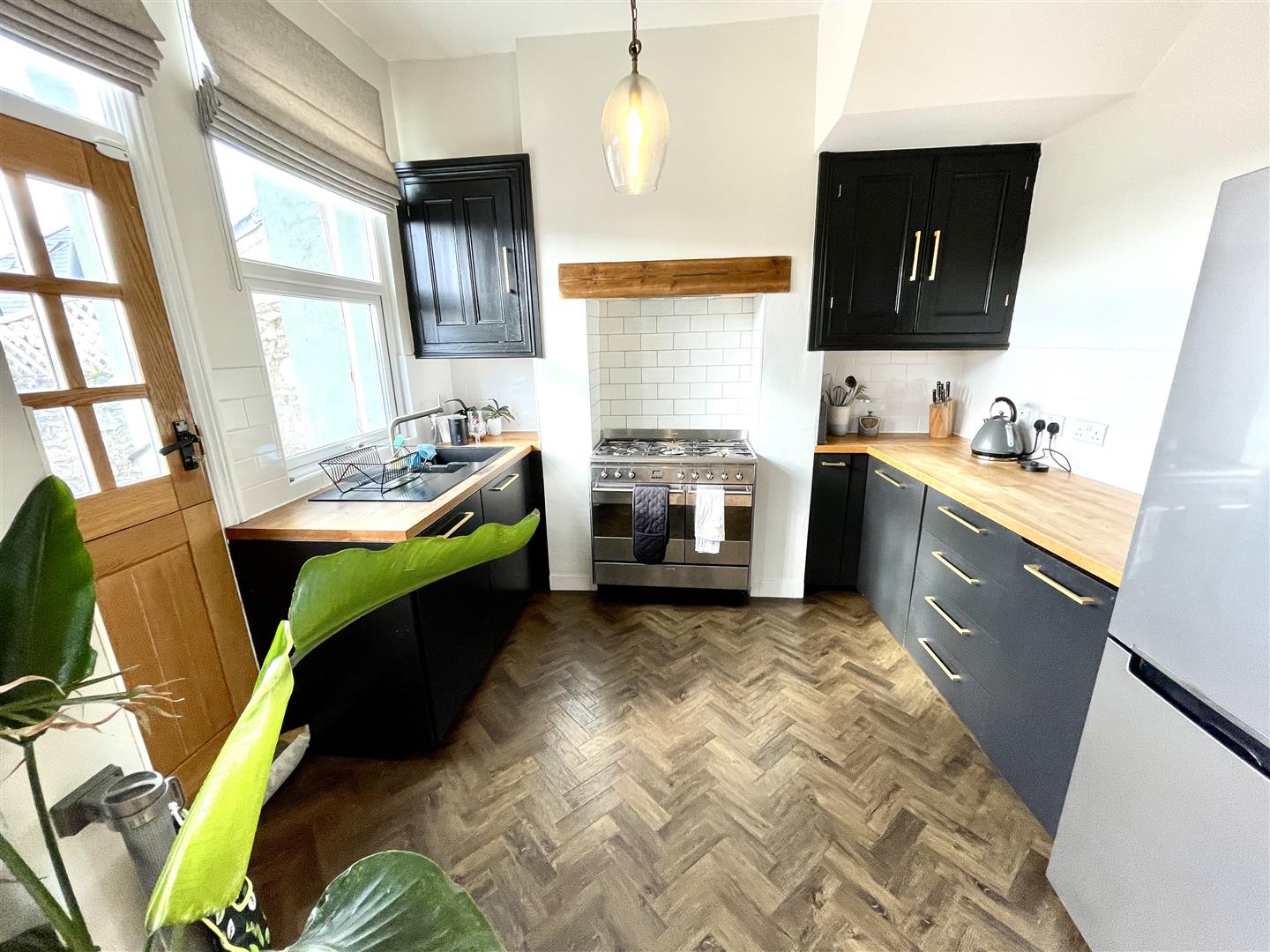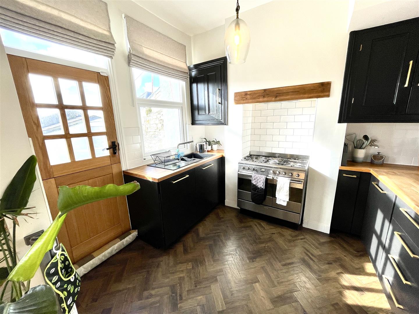 Kitchen Area - 3.13 x 2.64 (10'3" x 8'7") - Series of matching eye-level and base units with wooden work surfaces and inset one-&-a-half bowl sink unit with mixer tap. Double-glazed window to the rear. Stable-style door to the rear leading to the courtyard. Free-standing range gas cooker in the alcove. Integrated dishwasher. Space for free-standing fridge/freezer.