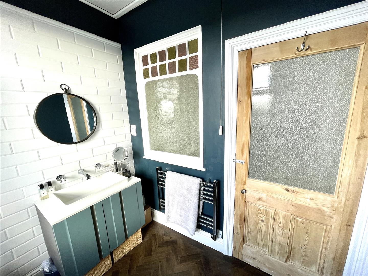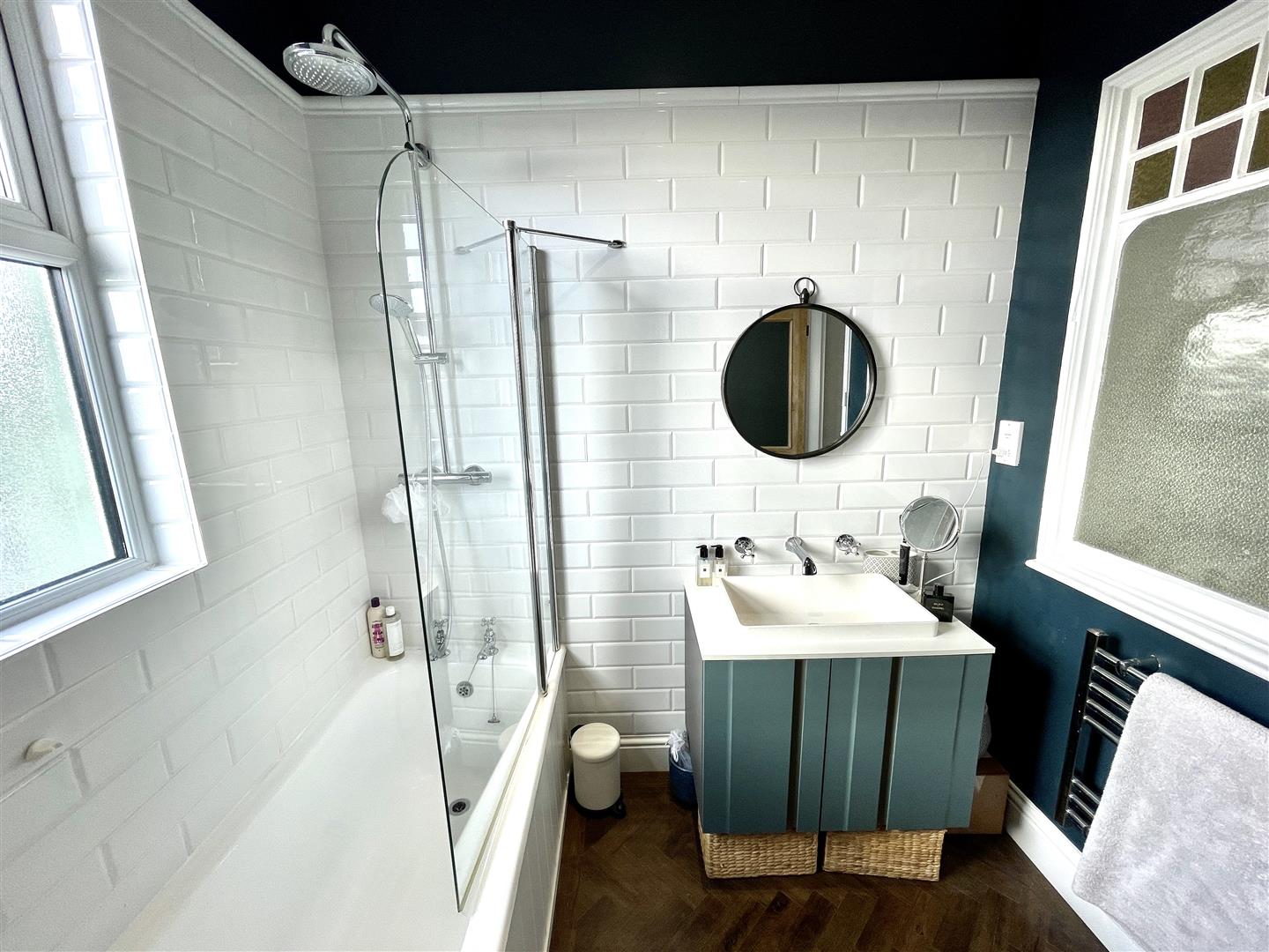 Bathroom - 2.36 x 2.28 (7'8" x 7'5") - Fitted with a white modern suite comprising panel bath with mixer tap, spray attachment and screen, sink unit with cupboard beneath and low-level toilet. Vertical towel rail/radiator. Additional electric heated towel rail. Double-glazed window to the rear.