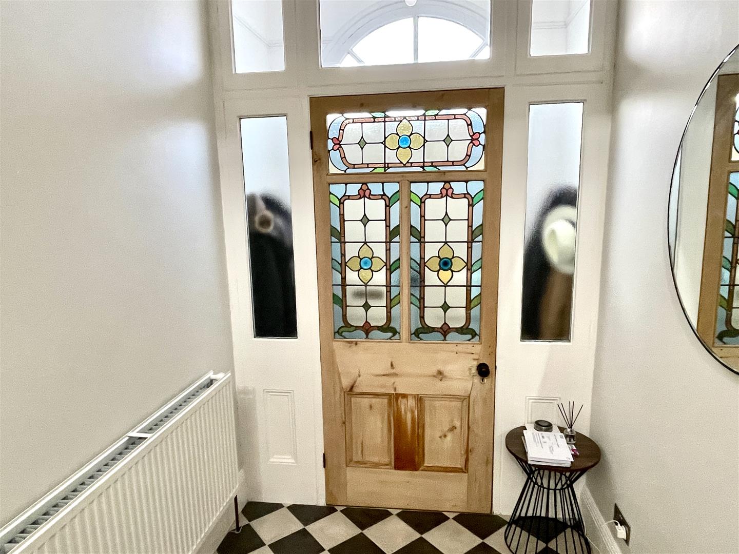 Entrance Porch - Stripped wooden ornate part-glazed inner door leading into the entrance hall.