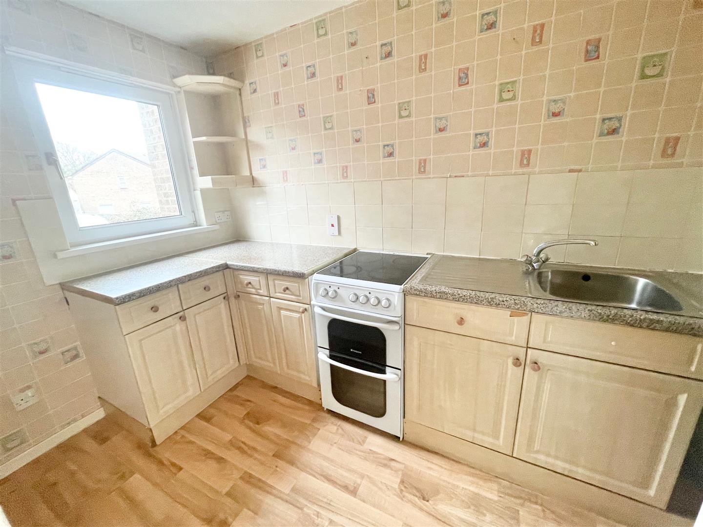 Kitchen - 3.34 x 1.78 incl kitchen units (10'11" x 5'10" inc - Series of matching eye-level and base units with rolled-edge work surfaces and tiled splash-backs. Single drainer sink unit with mixer tap. Free-standing electric cooker. Space and plumbing for washing machine. Space for fridge-freezer.