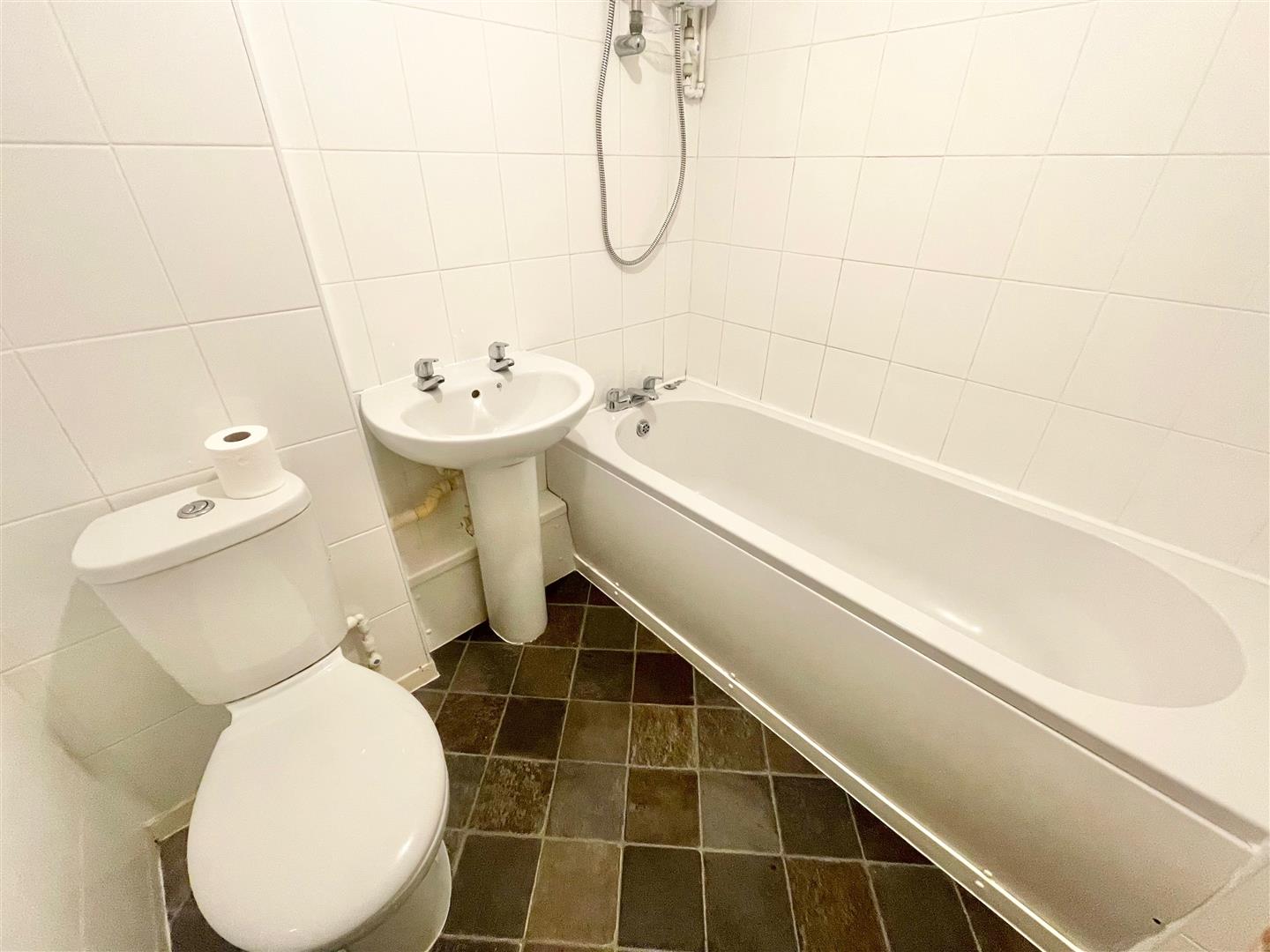 Bathroom - 1.91 x 1.54 (6'3" x 5'0") - White modern suite comprising a bath with mixer tap and an electric shower with spray attachment, pedestal wash basin and low level toilet.