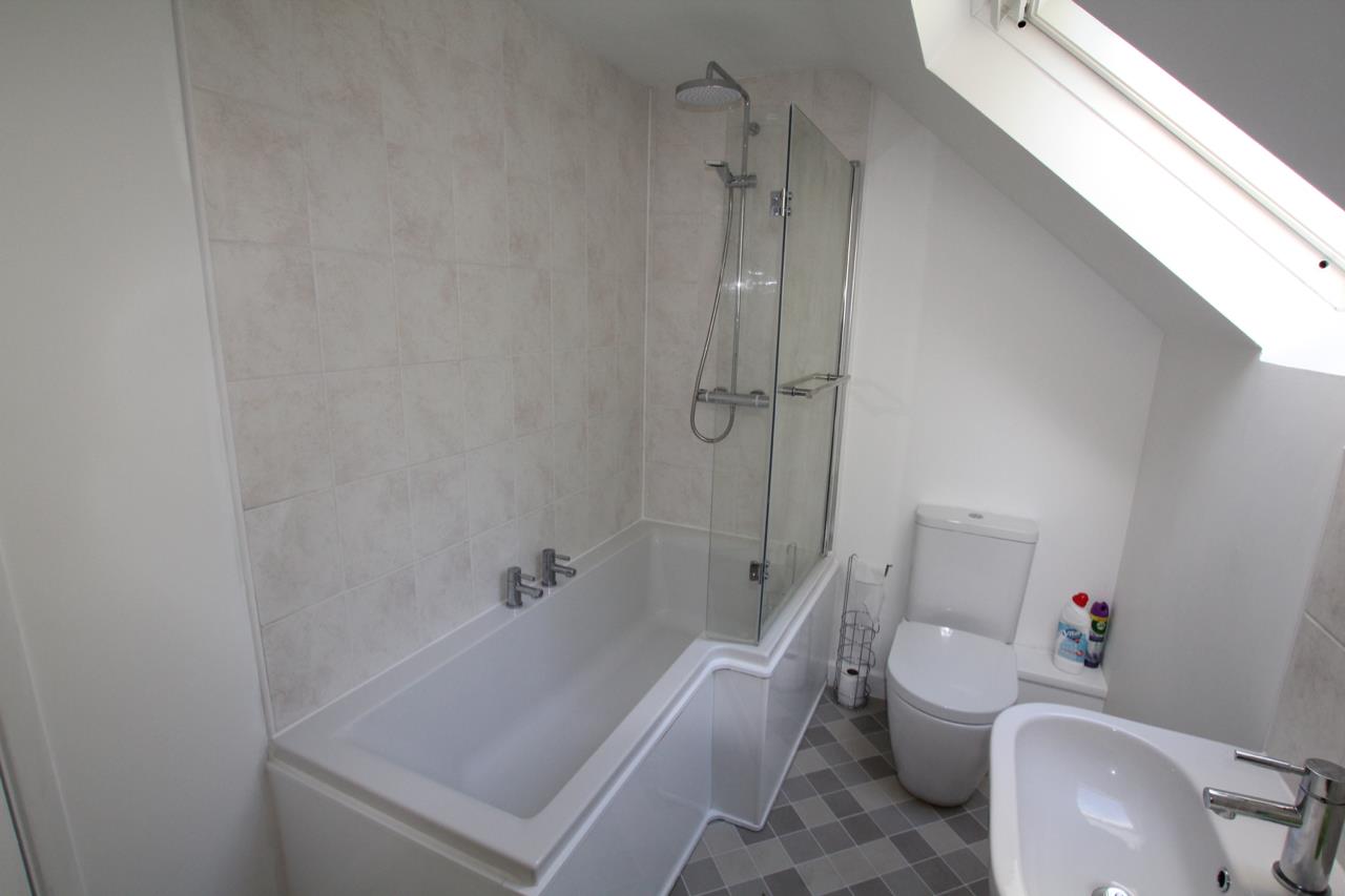 Bathroom - 2.86 x 1.76 (9'4" x 5'9") - Modern white suite including pedestal wash handbasin and low level wc. 'P'-shaped bath with shower unit and spray attachment above. Velux-style window to the rear. Radiator.