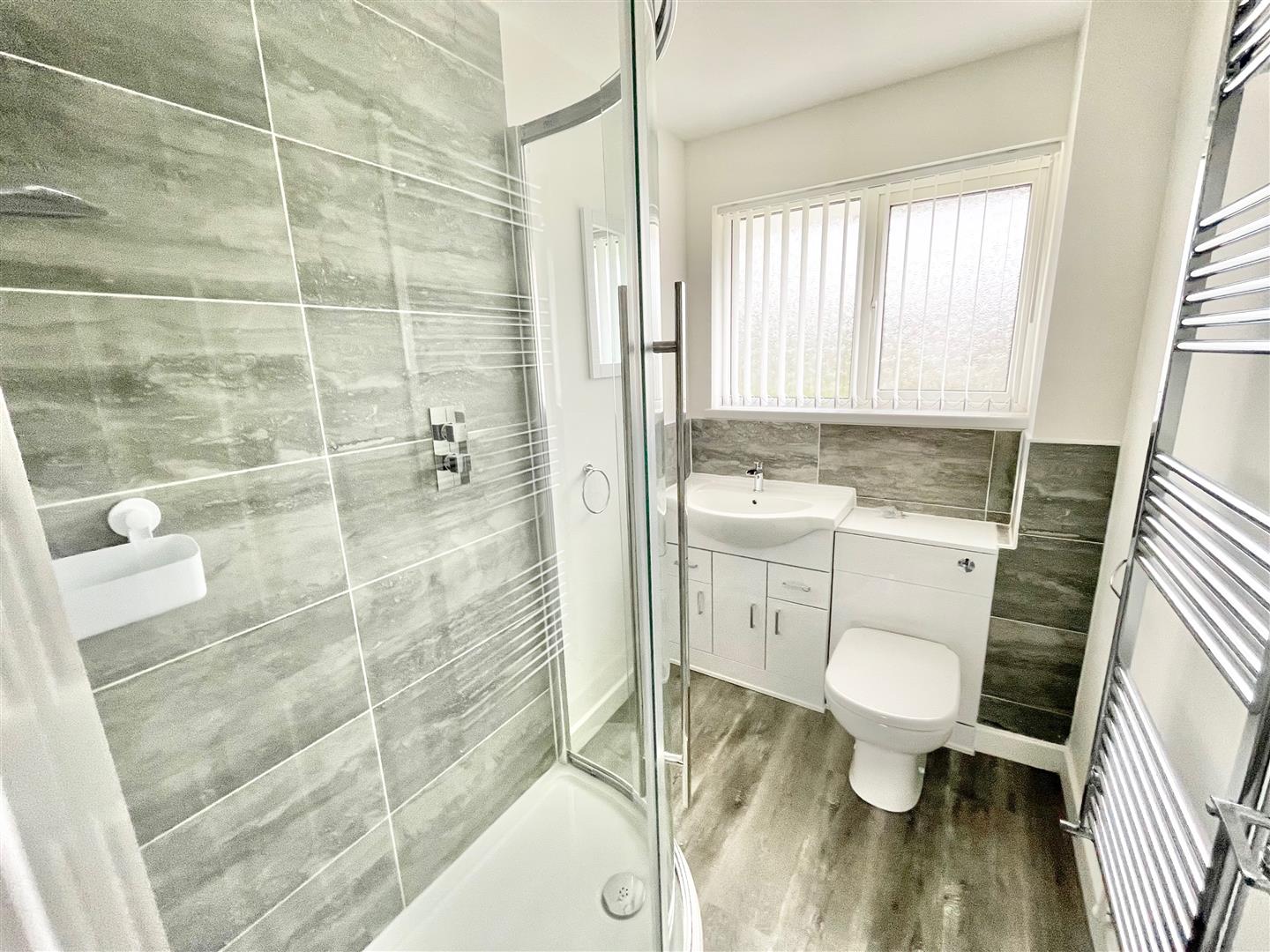 Bathroom - 2.24 x 1.49 (7'4" x 4'10") - White modern suite including a panel bath with shower screen and an electric shower oven, pedestal wash hand basin and low level toilet. Tiled walls. Tiled floor. Obscured double-glazed window to the rear elevation.