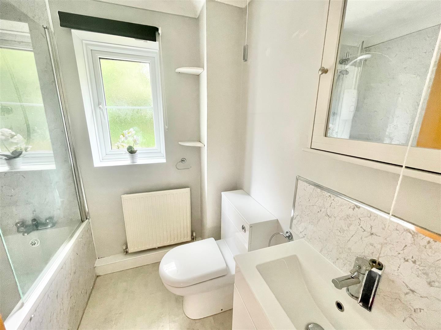 Bathroom - Comprising a panel bath with shower screen, shower unit and spray attachment, low level wc and sink unit with cupboard beneath. Obscured double-glazed window to the rear elevation.