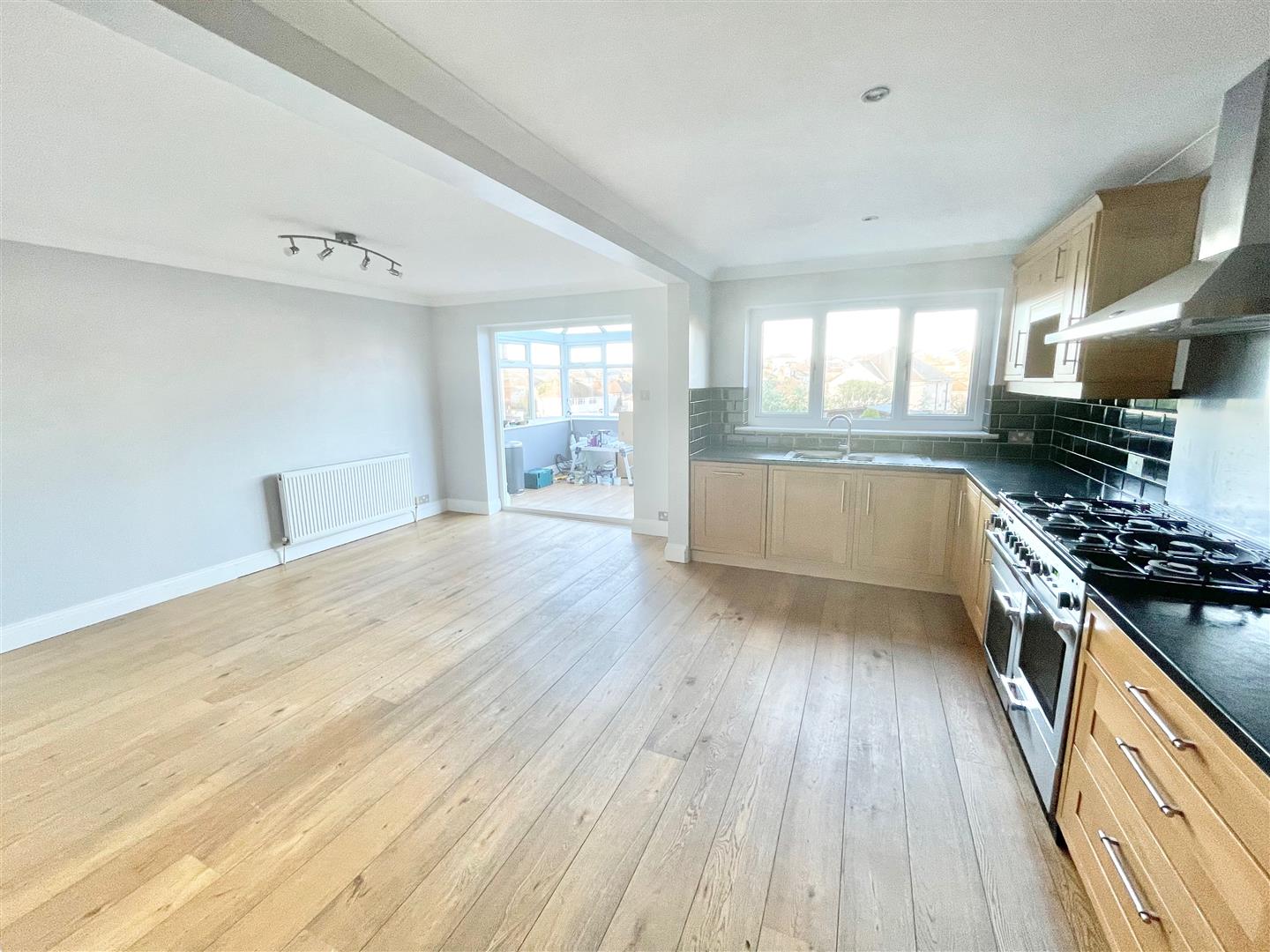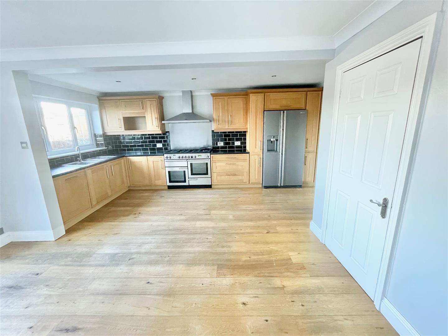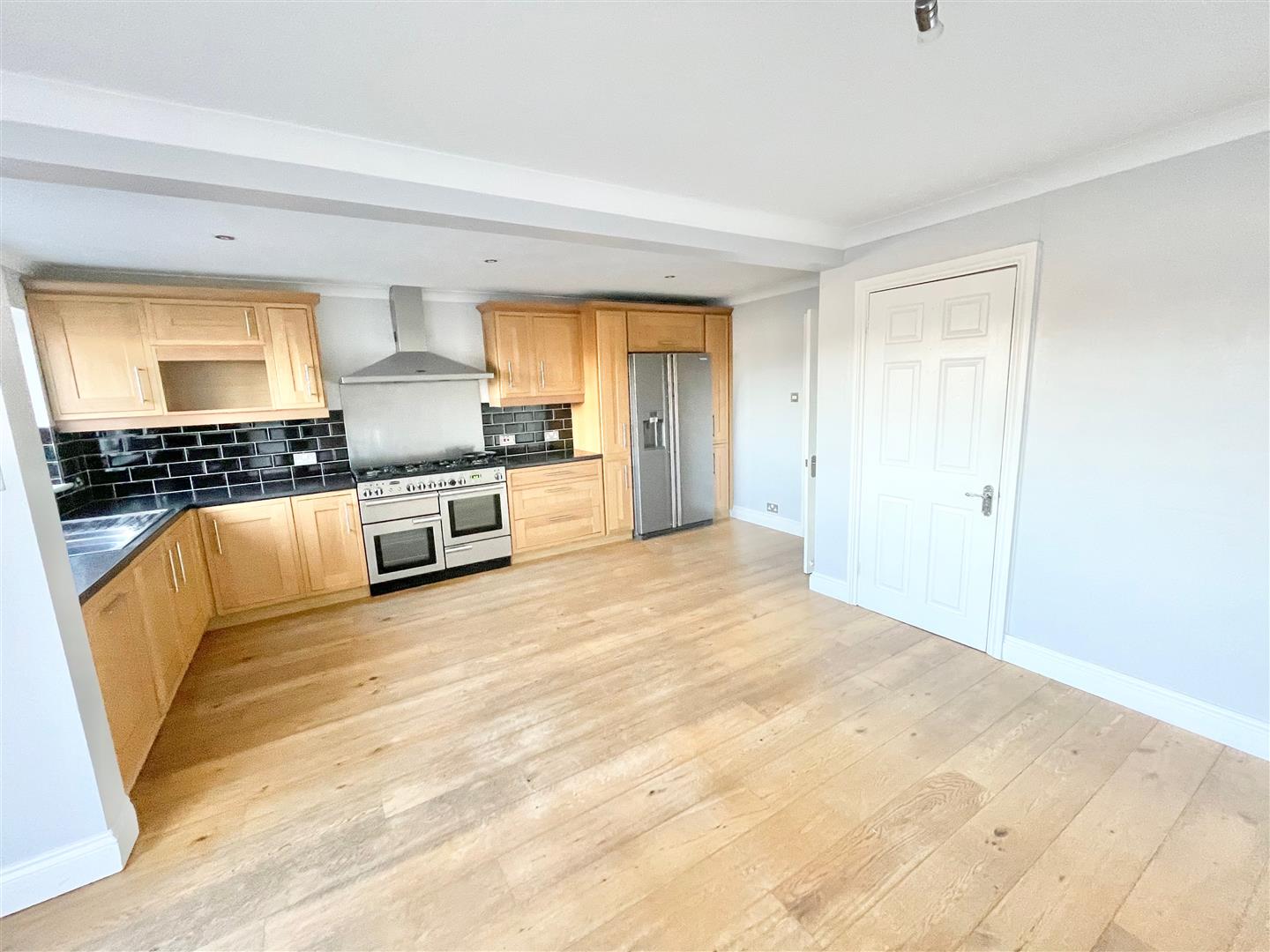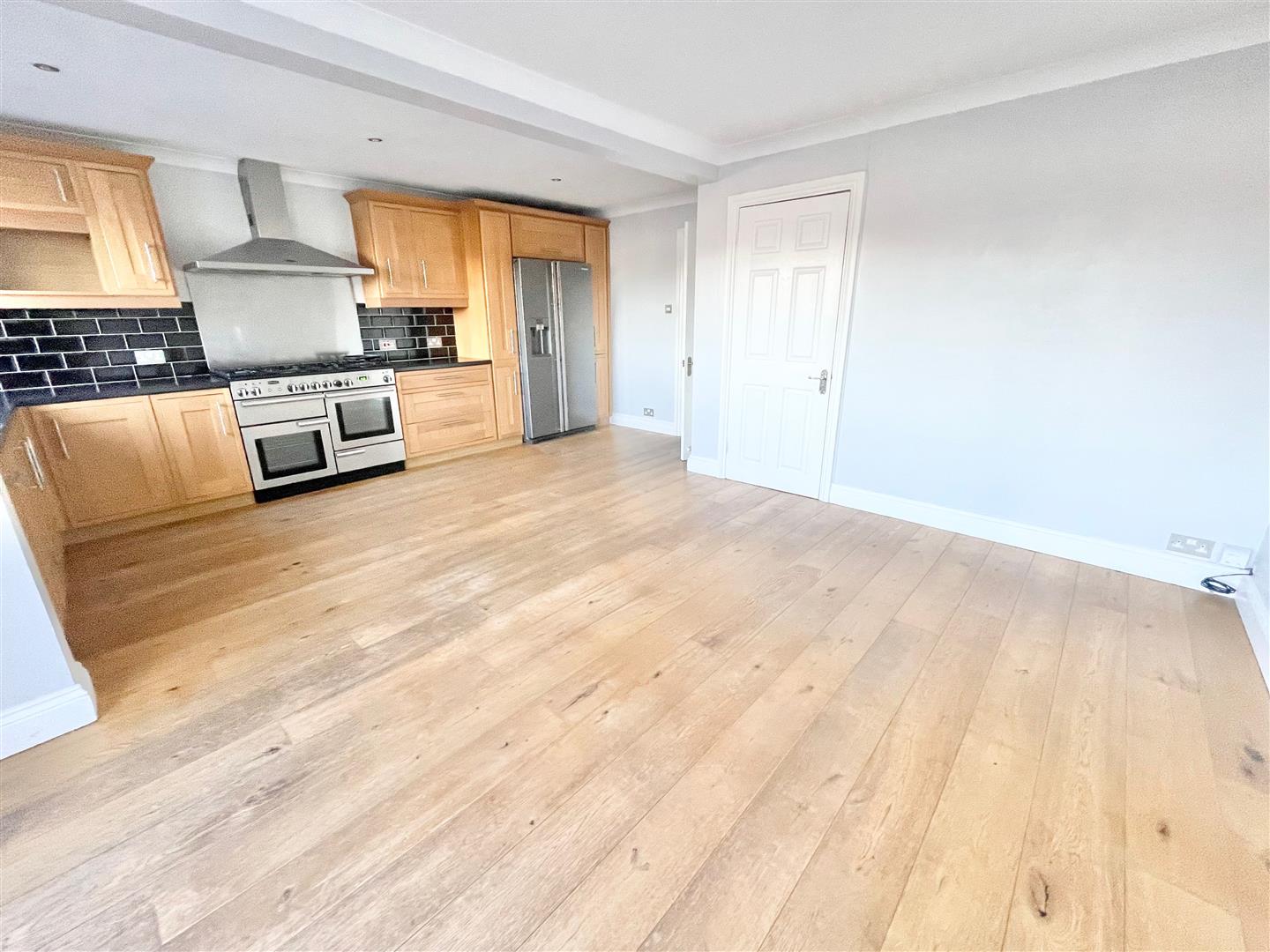 Kitchen/Dining Room - 18' 2" x 16' 10" (5.56m x 5.15m) narrowing to 4.23 - The kitchen is fitted with a series wooden-fronted matching eye-level and base units with blackened roll-edged work surfaces and tiled splash-backs. Inset single-drainer 1? bowl stainless-steel sink unit with mixer tap. Built-in dishwasher. American-style fridge/freezer - which is included within the tenancy. Free-standing gas-fired range cooker. Double-glazed window to the rear. Built-in storage cupboard. Open plan access to the conservatory.