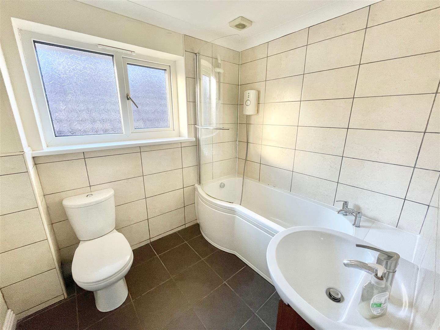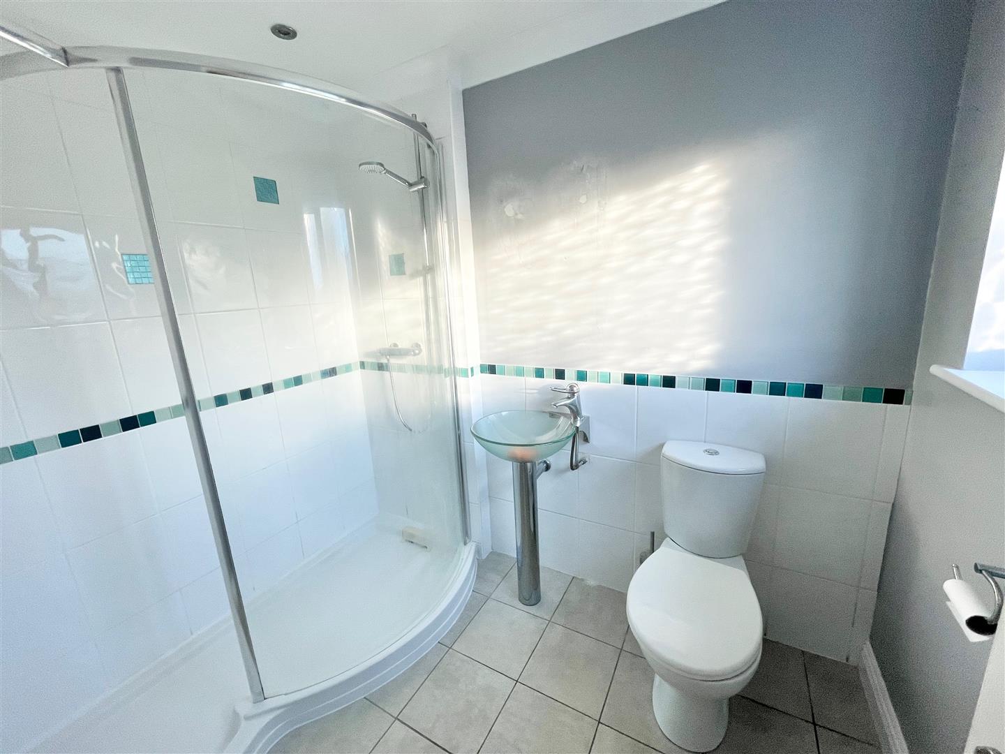 Ensuite Shower Room - 7' 6" x 5' 9" (2.29m x 1.77m) - Obscured double-glazed window to the front. White suite comprising 'P'-shaped shower unit with tiled area surround, pedestal wash handbasin and low-level toilet.