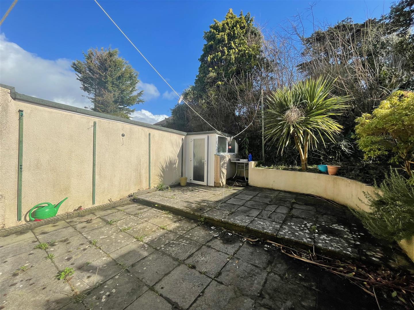 Outside - To the side of the property a driveway provides off-road parking and leads through to a paved garden area with raised planted flower beds and a PVC store.
