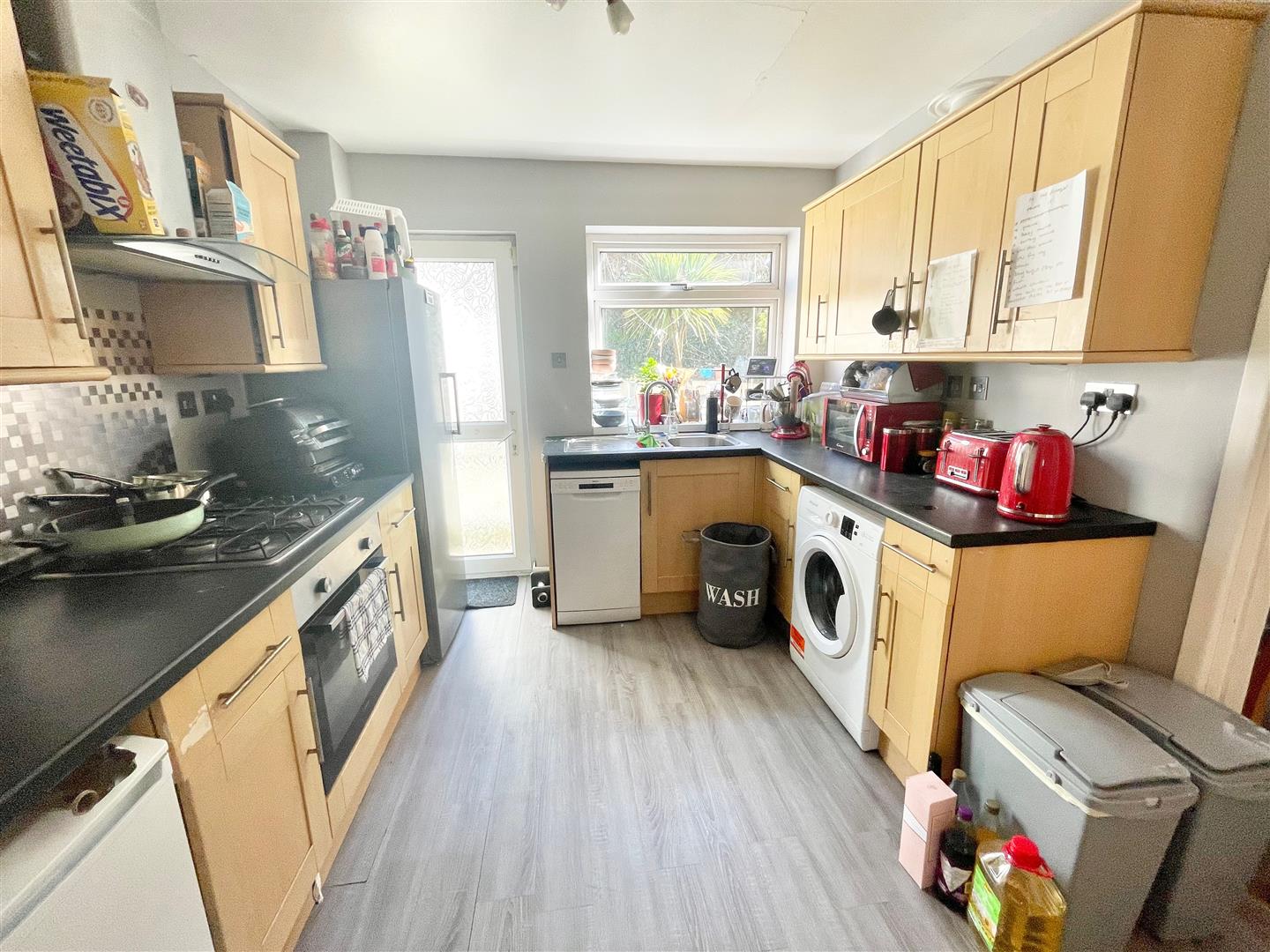 Kitchen - 3.03 x 2.83 incl kitchen units (9'11" x 9'3" incl - Series of beech-effect matching eye-level and base units with blackened work surfaces. Inset 4-ring gas hob with an electric oven beneath. Space and plumbing for a slimline dishwasher. Space for washing machine. Double-glazed window to the rear. Door providing access to the rear garden. Door returning to the hallway.