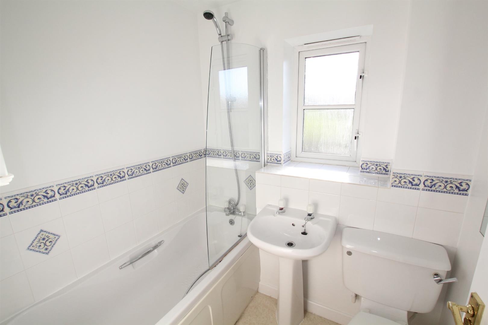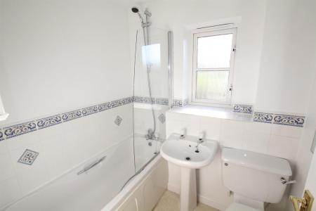 Bathroom - Fitted with a white modern suite comprising panel bath with mixer tap, spray attachment and shower screen, pedestal wash handbasin and low-level wc. Obscured double-glazed window to the rear.